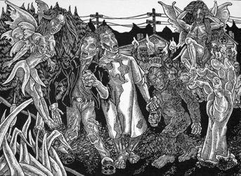 Woodcut print by Derrick Riley KY Monster Mash Series