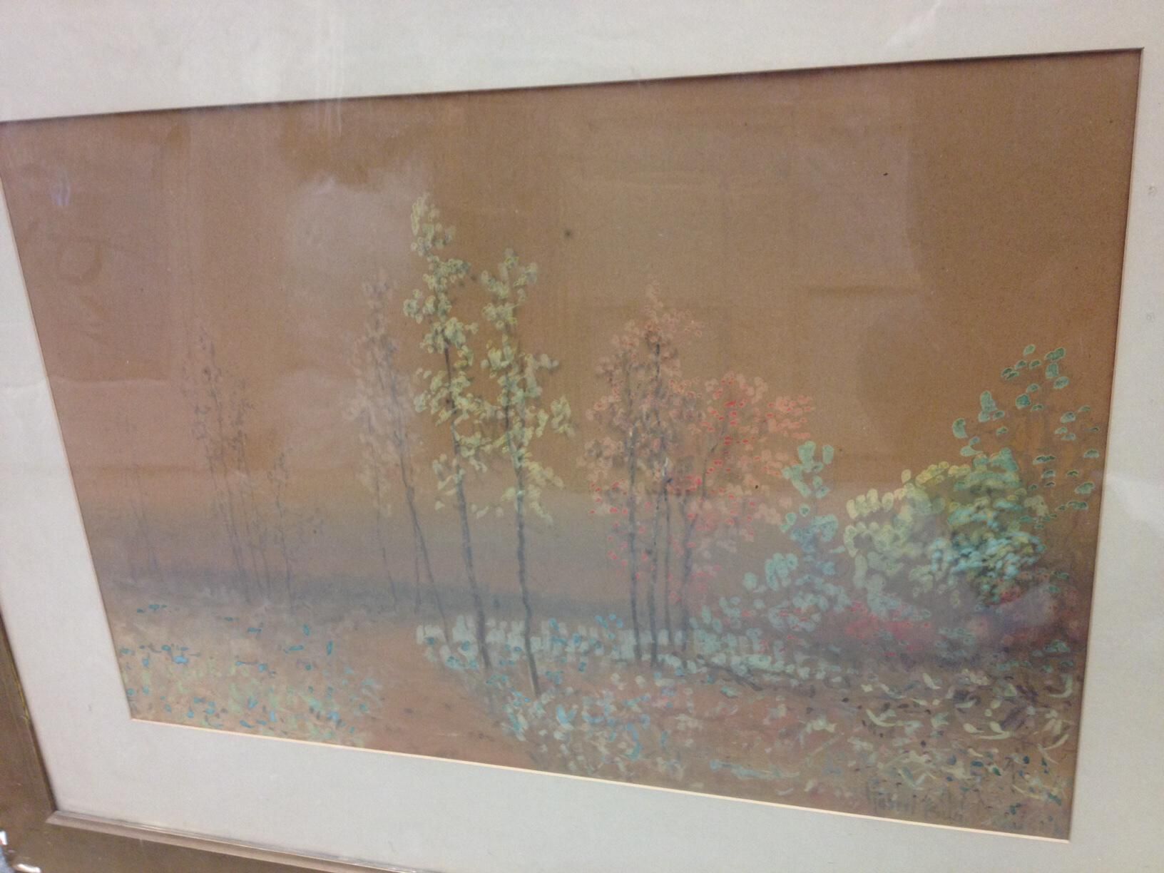 Spring trees in different pastel colors. Paper appears to be badly acidified. Possibly water color?Collection