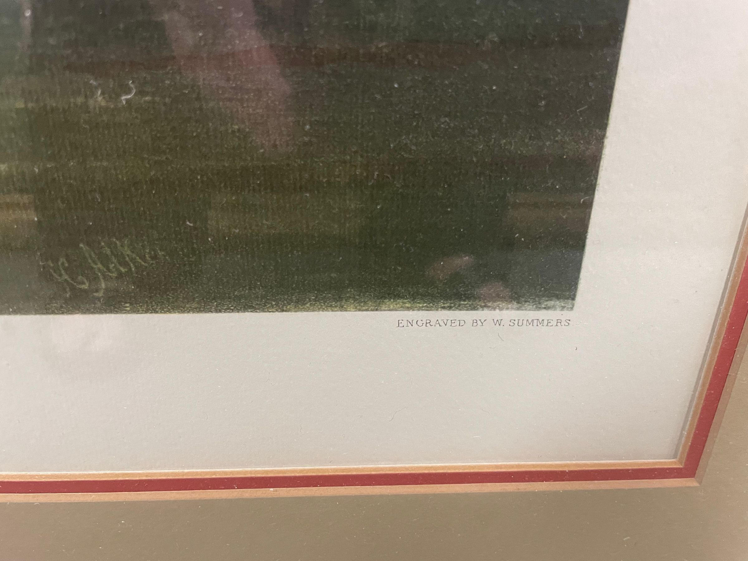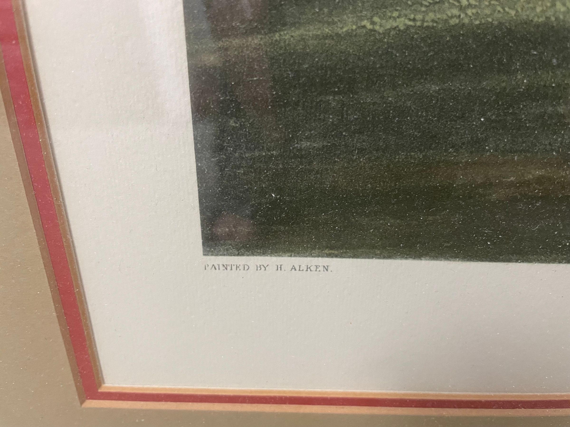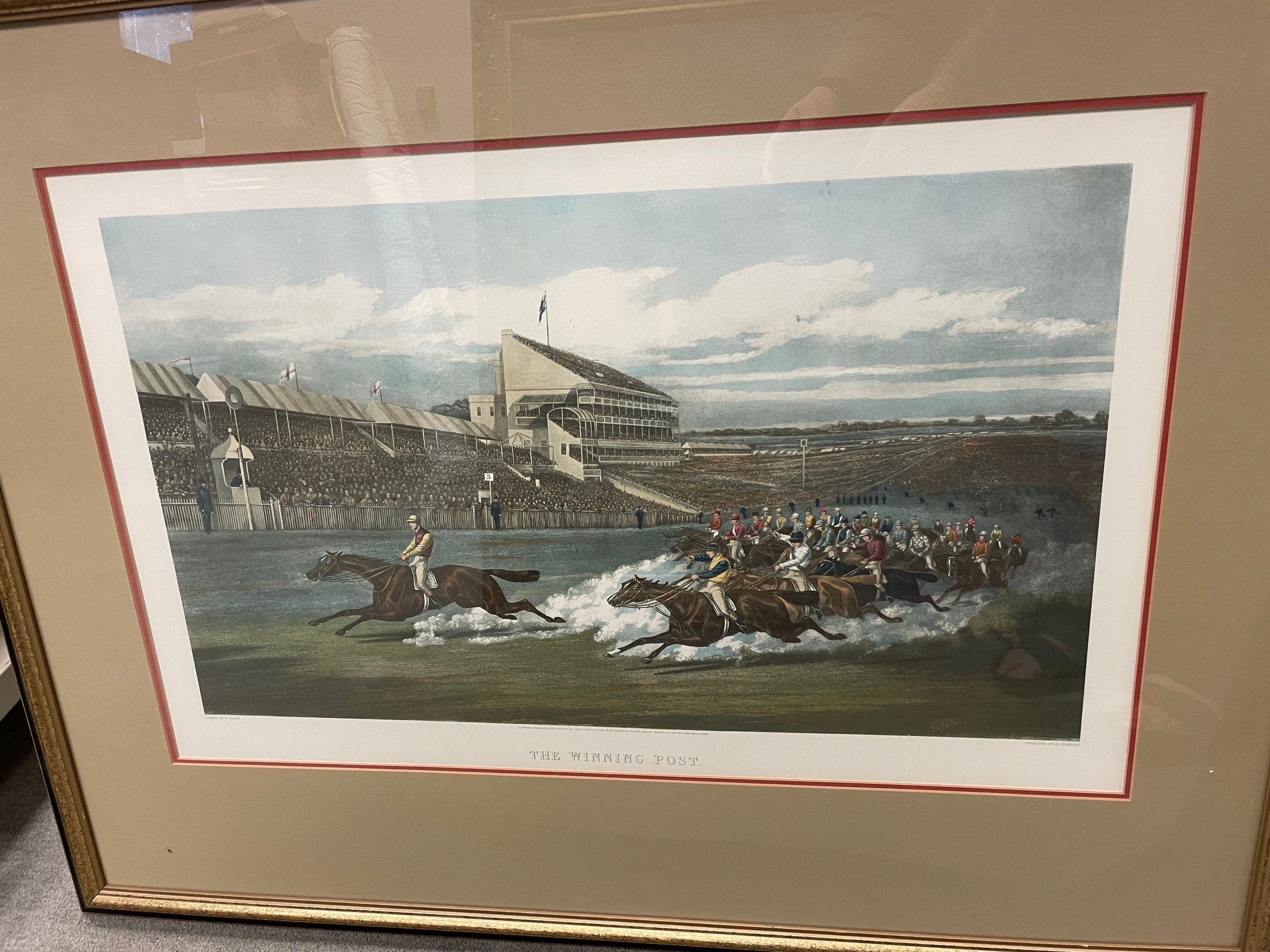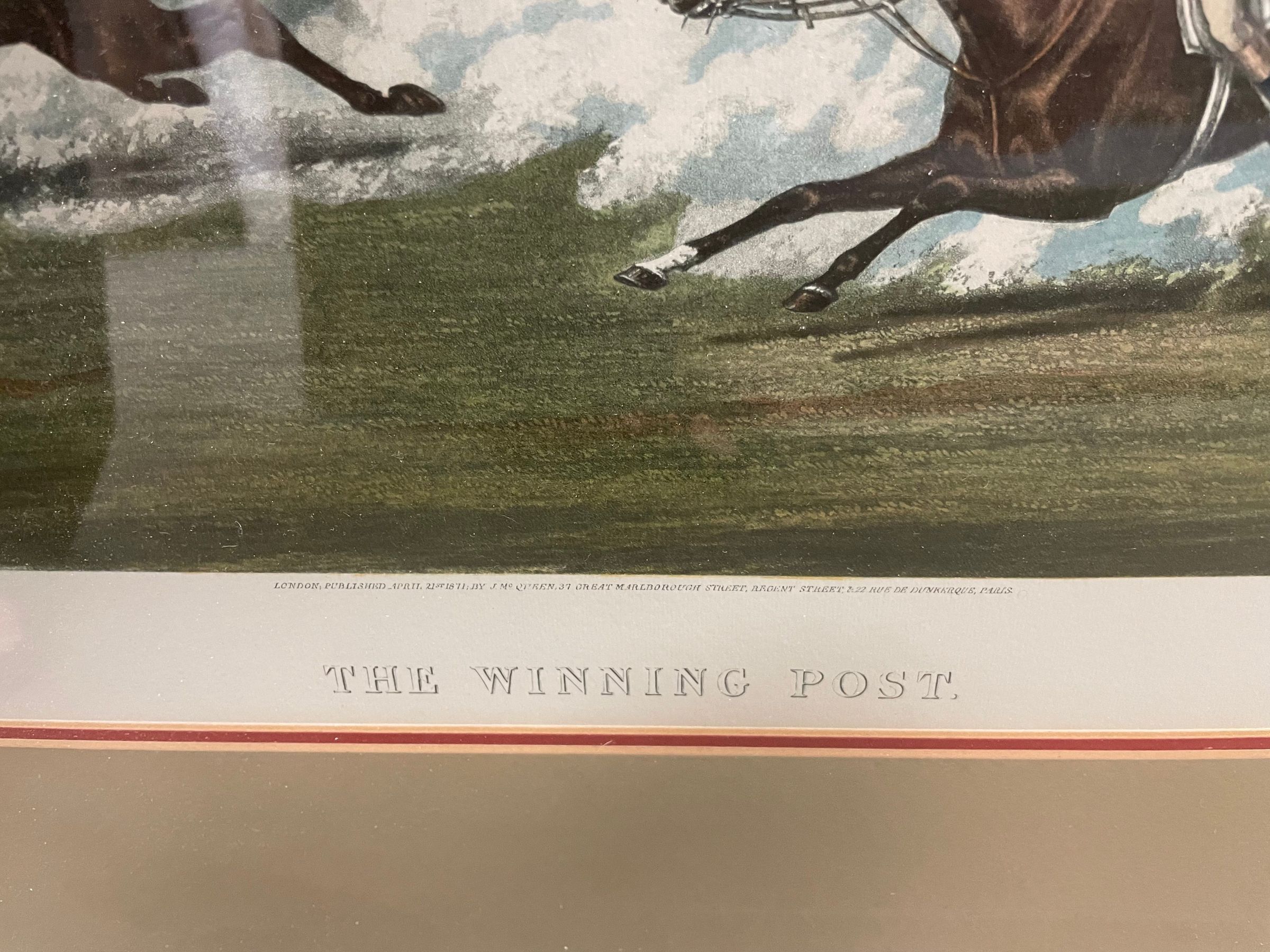 Titles the Winning Post, this is a print of artwork created by Henry Alken. Depicts a horse race with a group of horses with riders racing from right to left. One rider is out front. There is a grandstand in the background filled with people. Published by J. McQueen.Made/Created