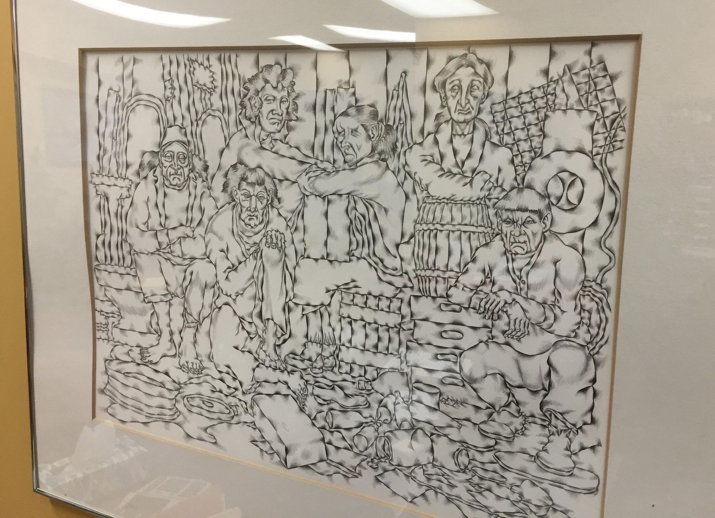 Six figures seated and standing with barrel, wheel hub, jars, quilt on the wall, etc. Pencil drawing.Collection