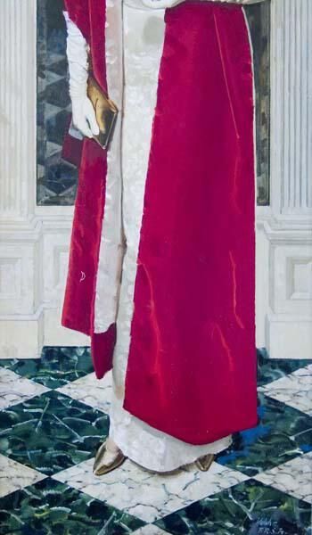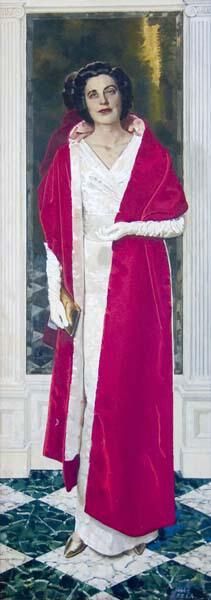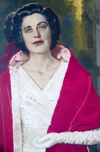 Large, full length portrait of Myrtle C. Mitchell for whom the Mitchell Fine Arts Building is named. She is dressed in white formal evening gown with a red velvet wrap.Collection