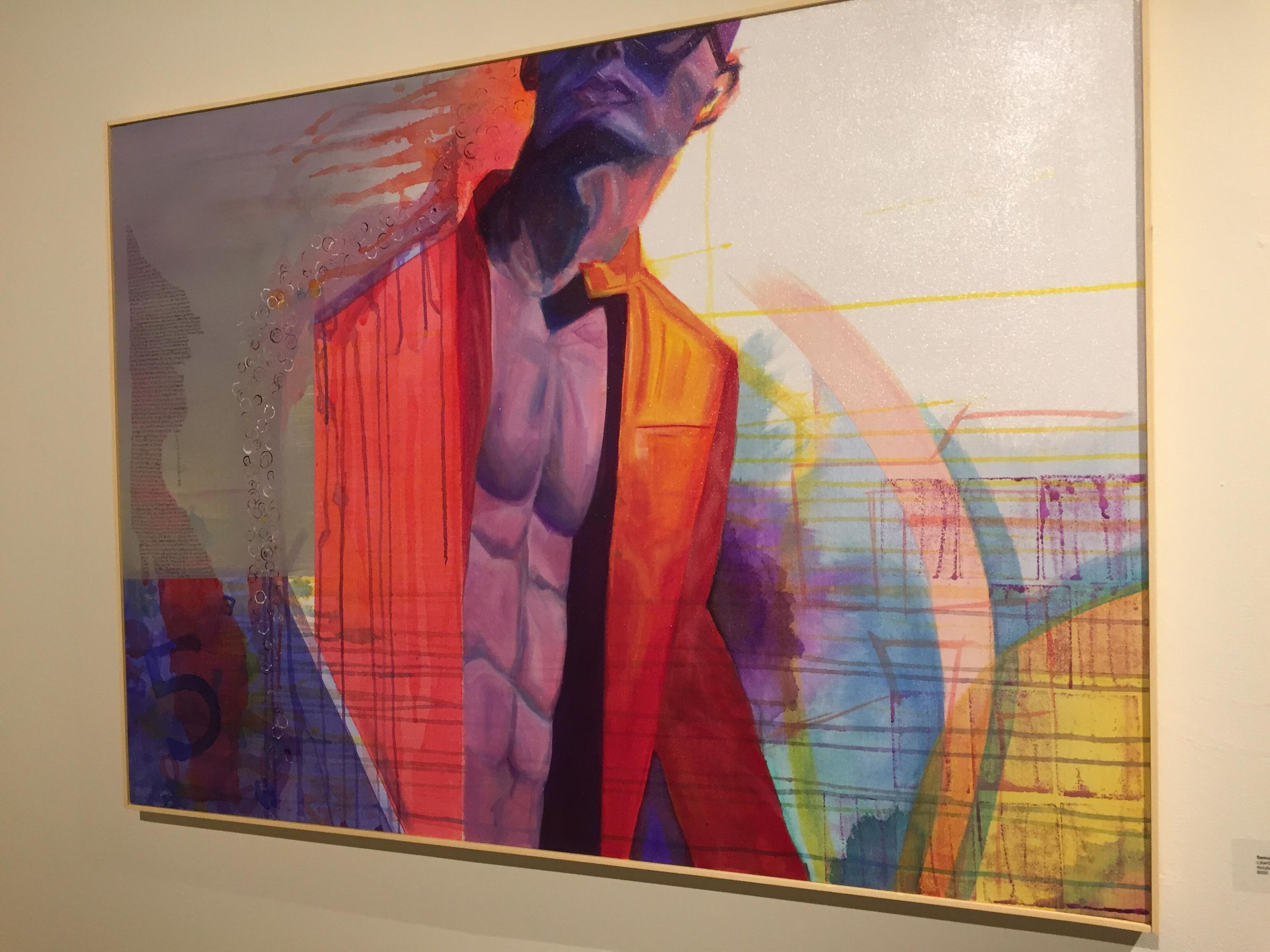 Colorful male torso with very small lettering in the background and some lines of dripping paint. Winner of "Best in Painting" in 2017 juried student art show.Collection