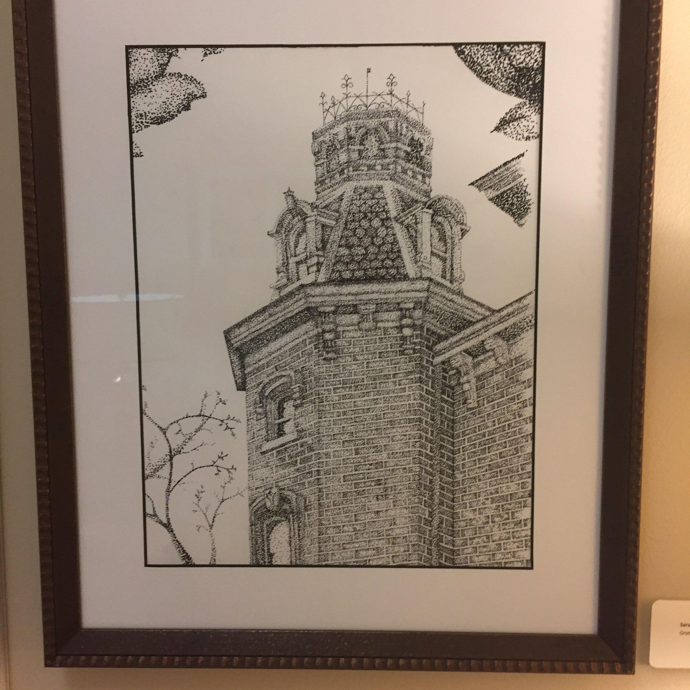 Pointalist or stippled pencil drawing of the tower of a house in Lexington. By Sarah Schaff, class of 2019.