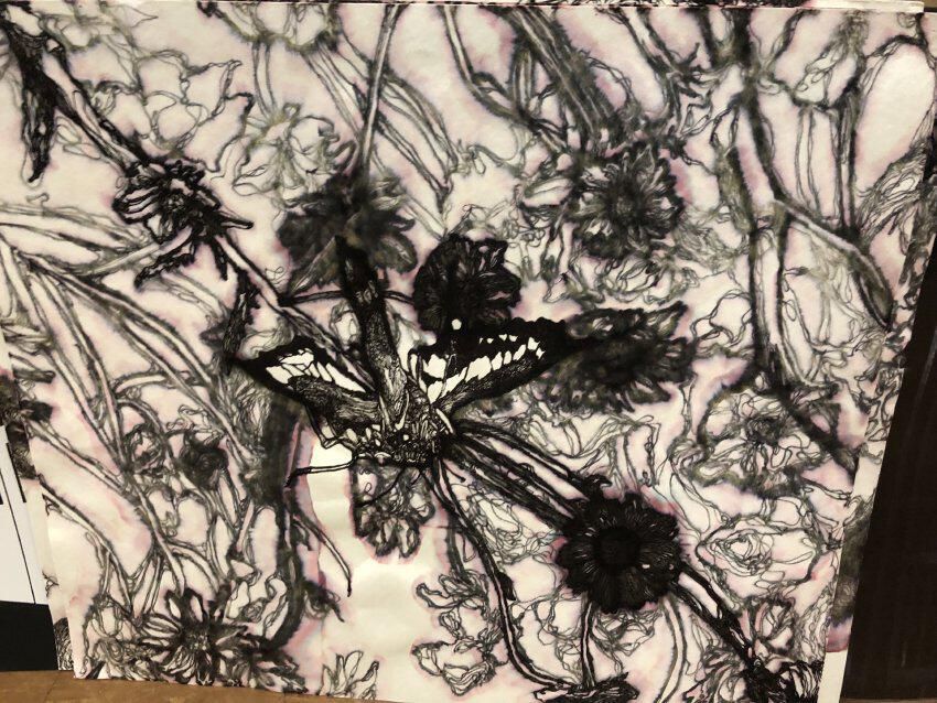 Water soluble pen on blotting paper. Fourth in a five part series called Predation. This drawing depicts a moth in flowers. Artist Kristen Frost is class of 2016.Collection