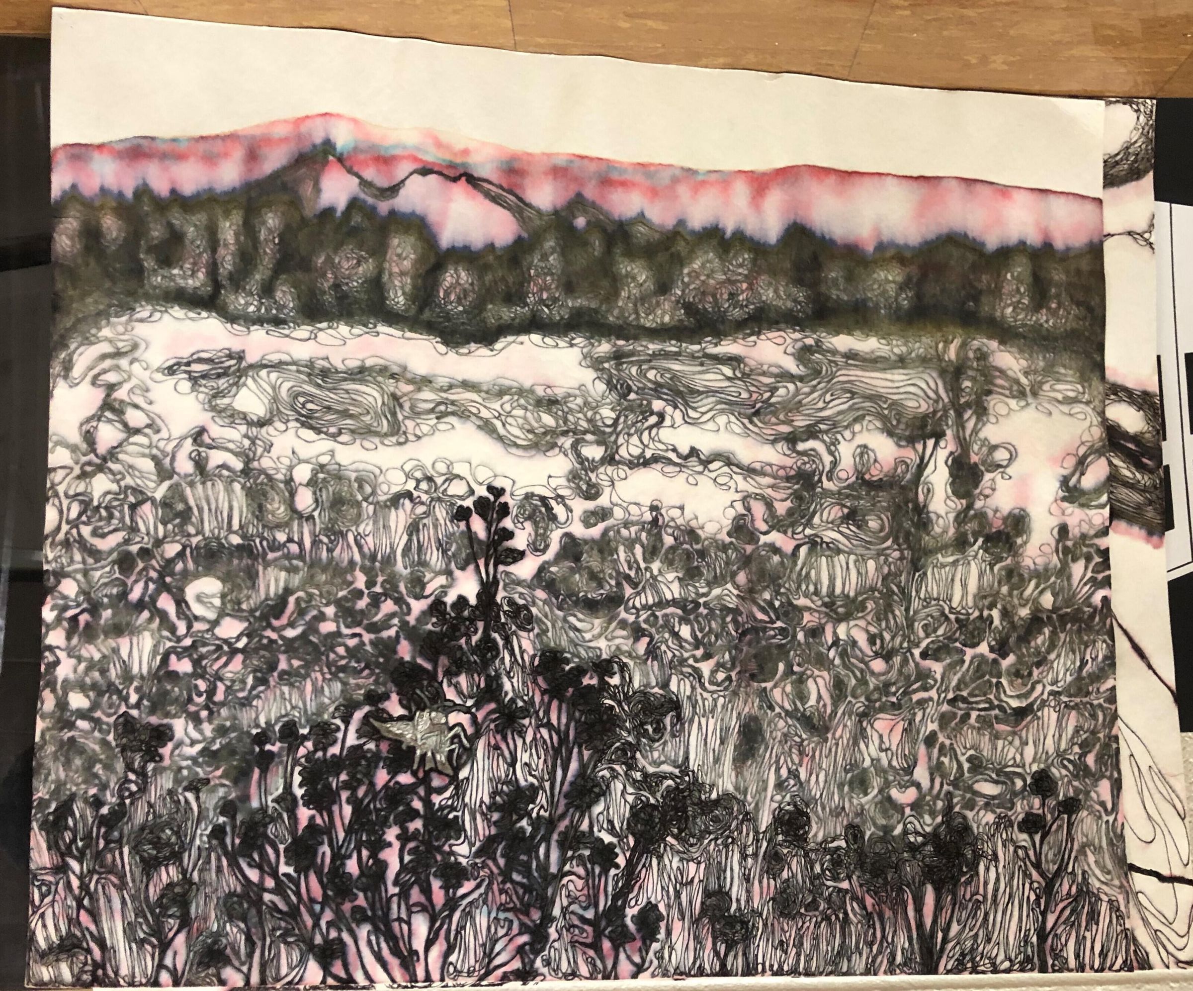 Water soluble pen on blotting paper. Fifth in a five part series called Predation. This drawing depicts landscape with a field and plants in the foreground. A moth is on one of the plants. Artist Kristen Frost is class of 2016.Collection