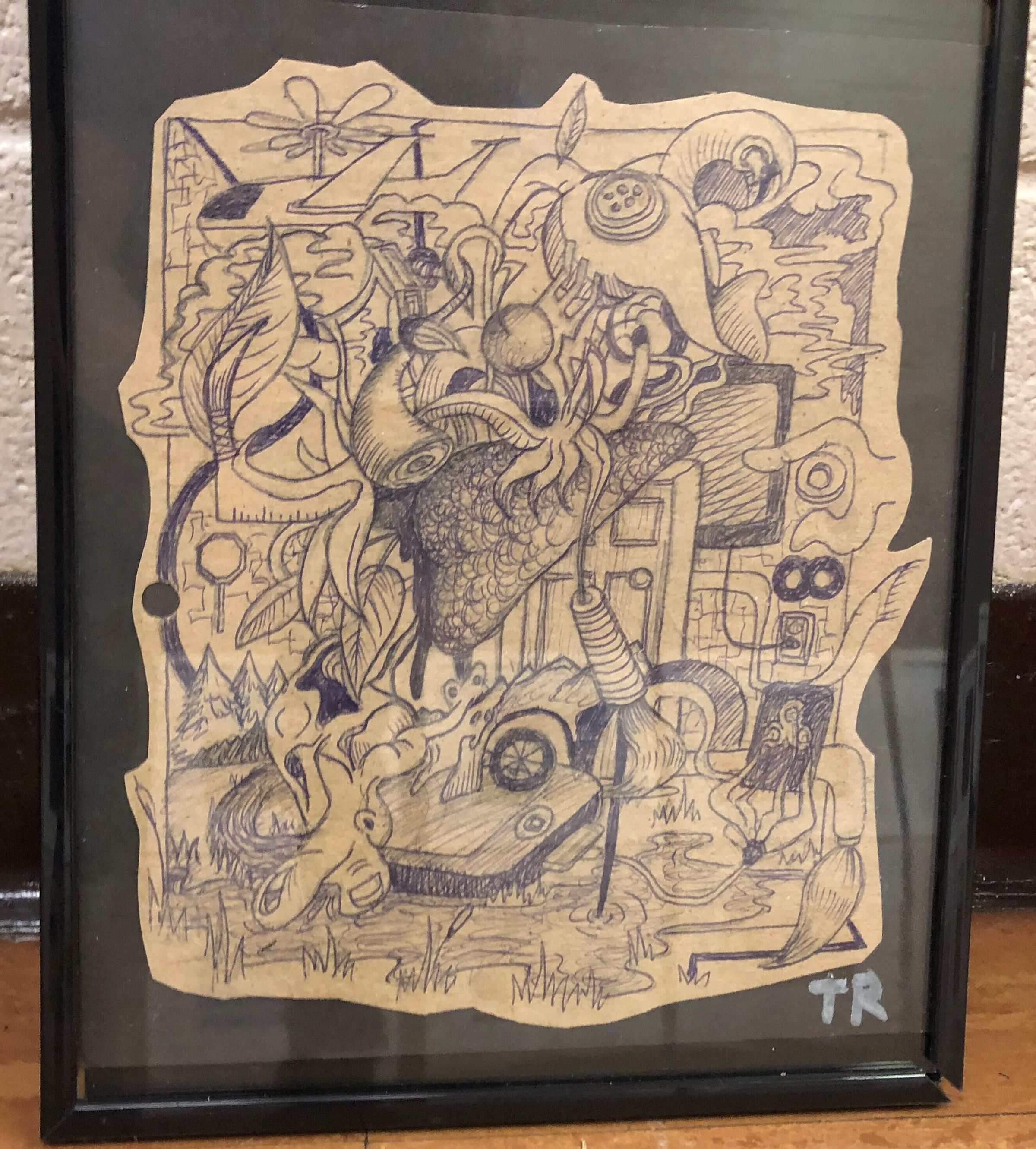 Pen on notebook back. This line drawing is a complex surreal doodle. Created by Transy grad Trent Redmon, class of 2015.Collection