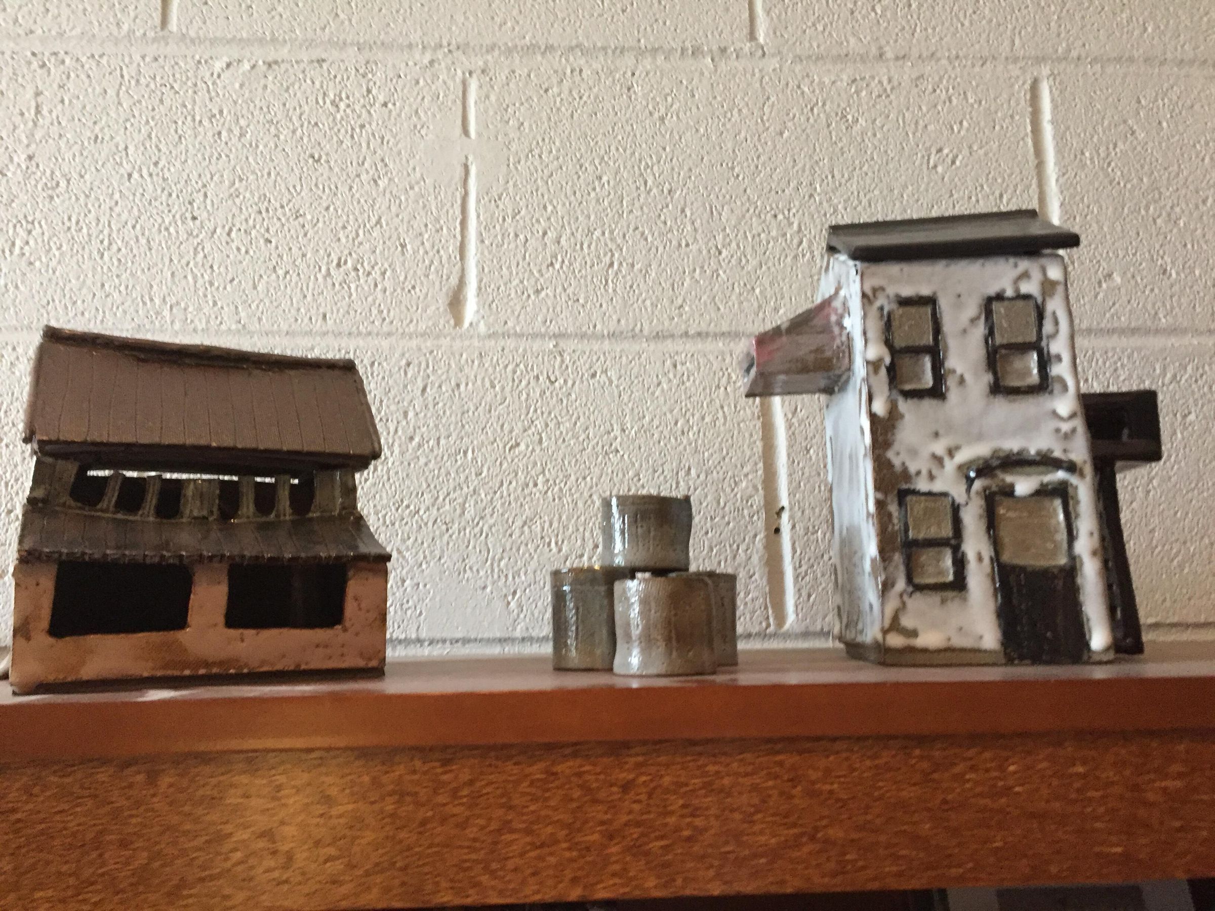 A ceramic teapot shaped like a house. The lid is the roof and is separate, and the handle is shaped like a fire escape. There are also four small tea cups shaped like garbage cans. There is a second house whose purpose is unclear. The roof on it is also removable.Collection