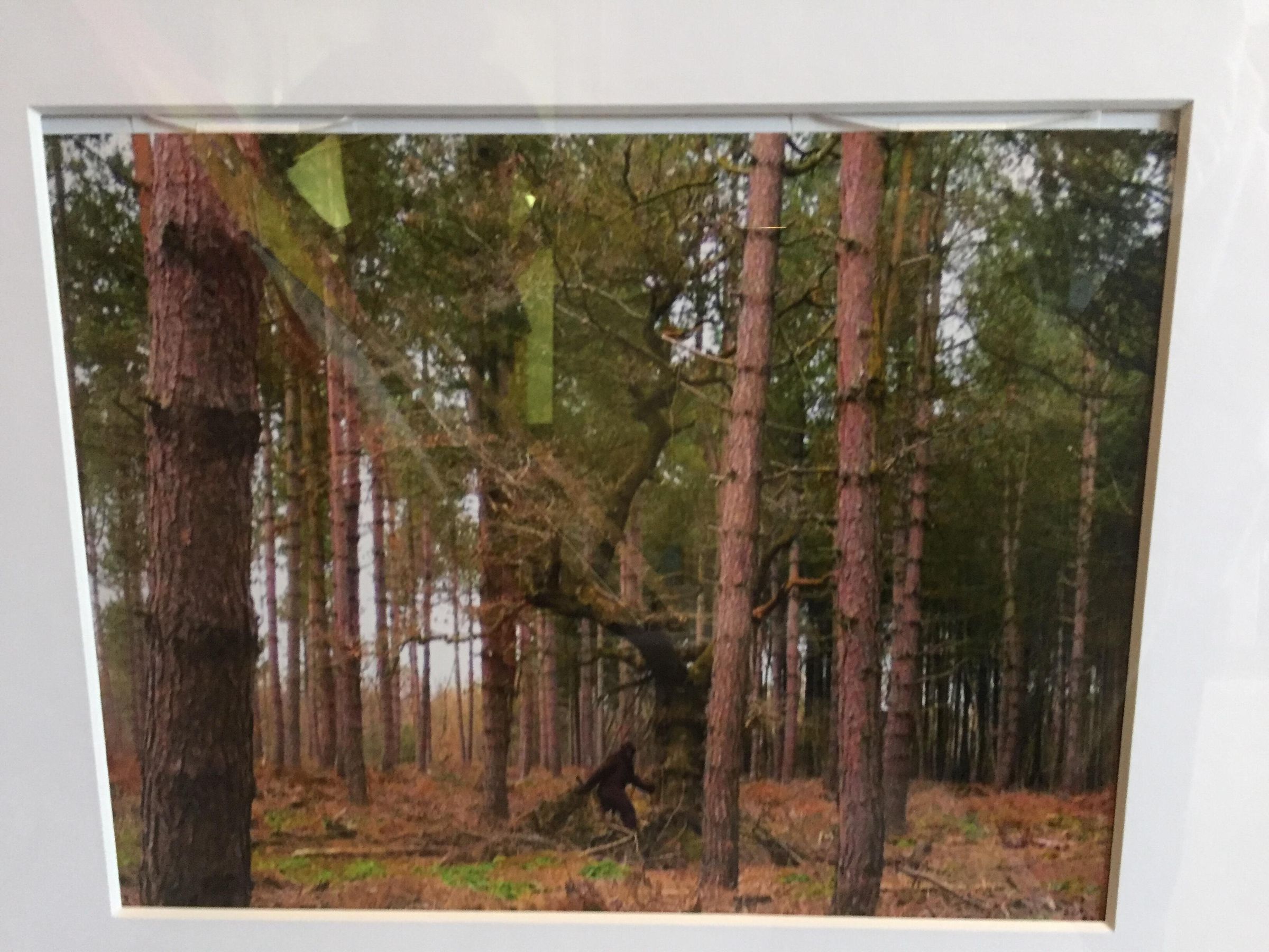 Artistic photograph of woods with an inset image of the sasquatch walking through. Artist is class of 2015.Collection
