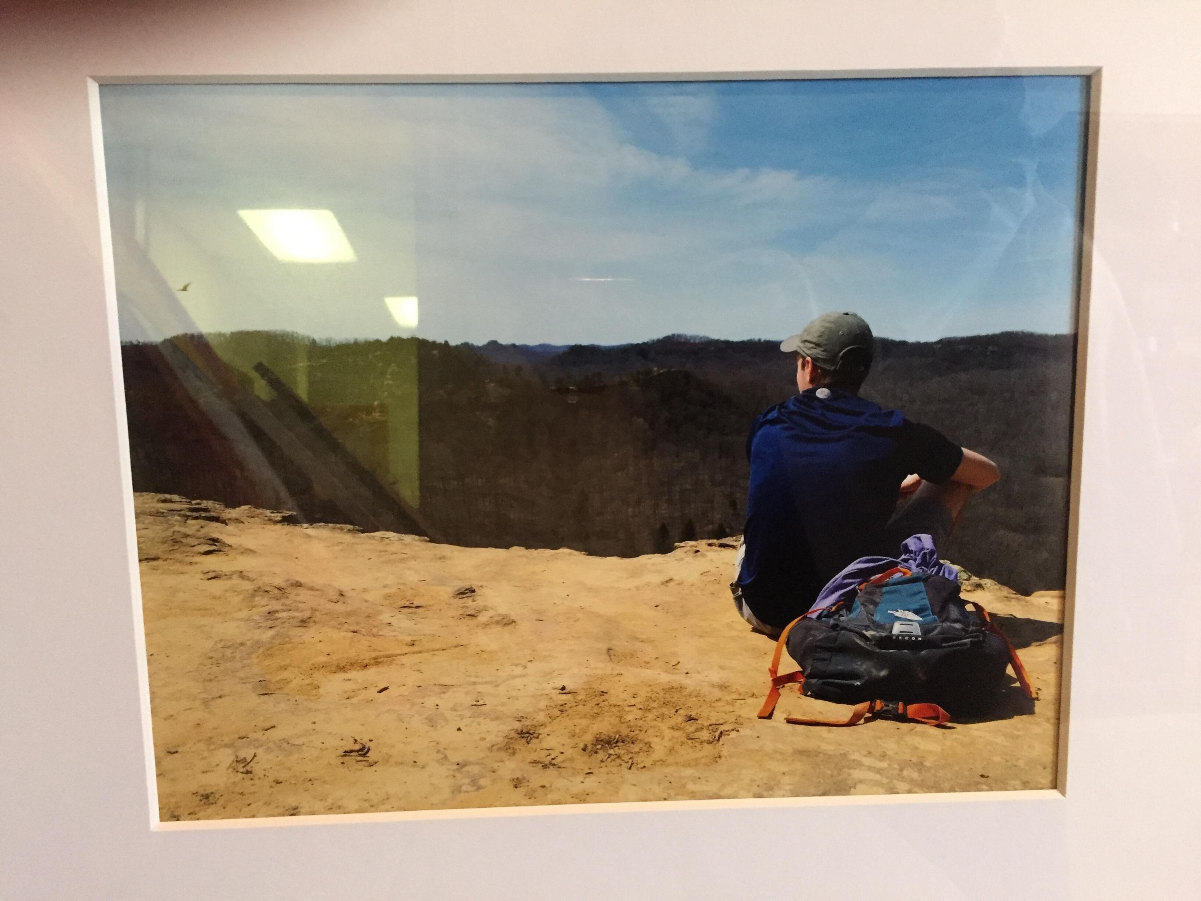 Artistic photograph of hiker sitting with back to camera and daypack on the ground beside them.Collection