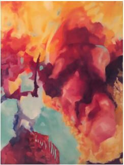 Bright abstract painting in reds and yellows with some turquoise. Artist is Transylvania class of 2016.Artwork Details