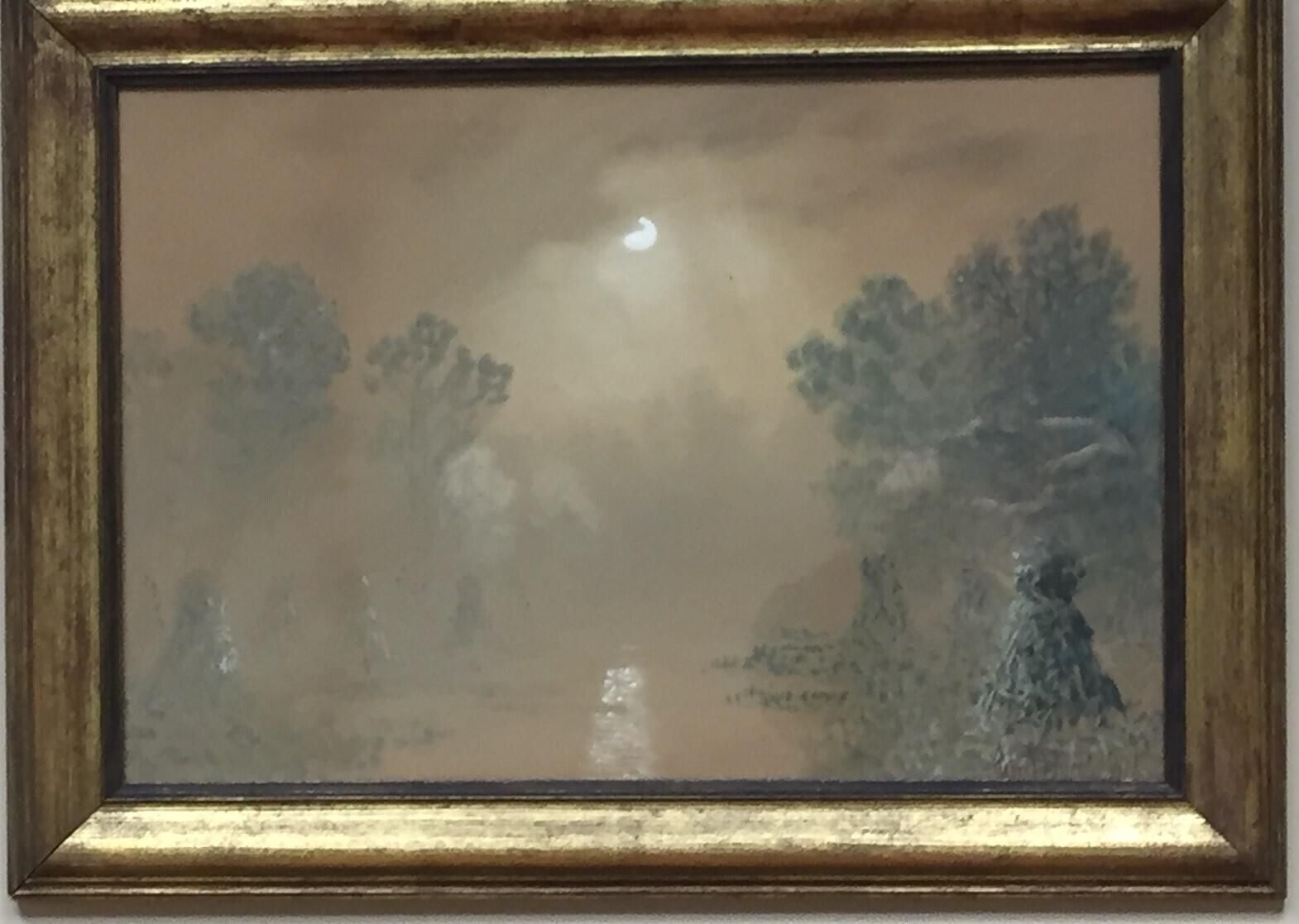 Moon centered in image and reflecting off a river or lake. Haystacks on either side with trees behind. Paper is either brown or has acidified.Collection