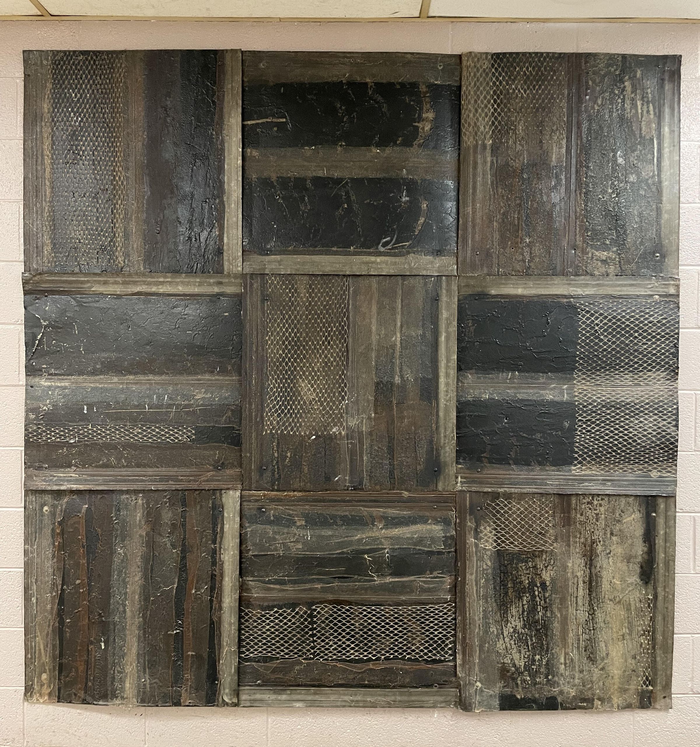 Larged mixed media tapestry of nine squares made up of old repurposed barn roof, netting, rivets, polymer mediumArtwork Details