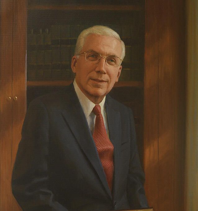 Three quarter portrait of Dr. Charles Shearer in a red tie holding a book. Shearer was President of Transylvania from 1983-2010.