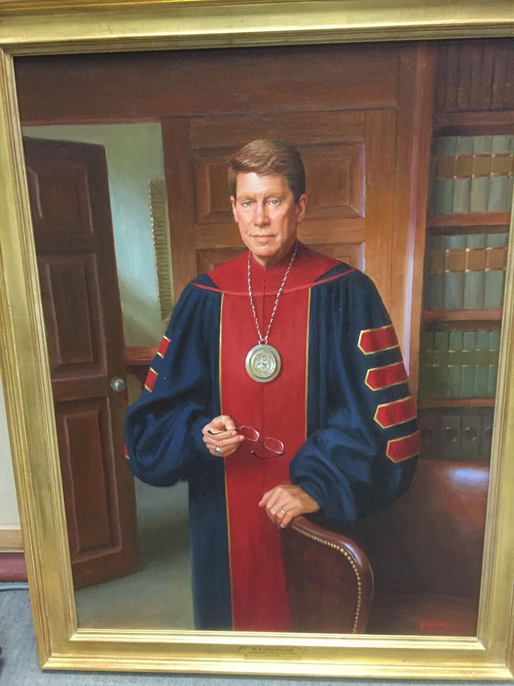 Portrait of R. Owen Williams, President of Transylvania from 2010-2014. The portrait is three quarter view. Williams appears in academic regalia.Collection