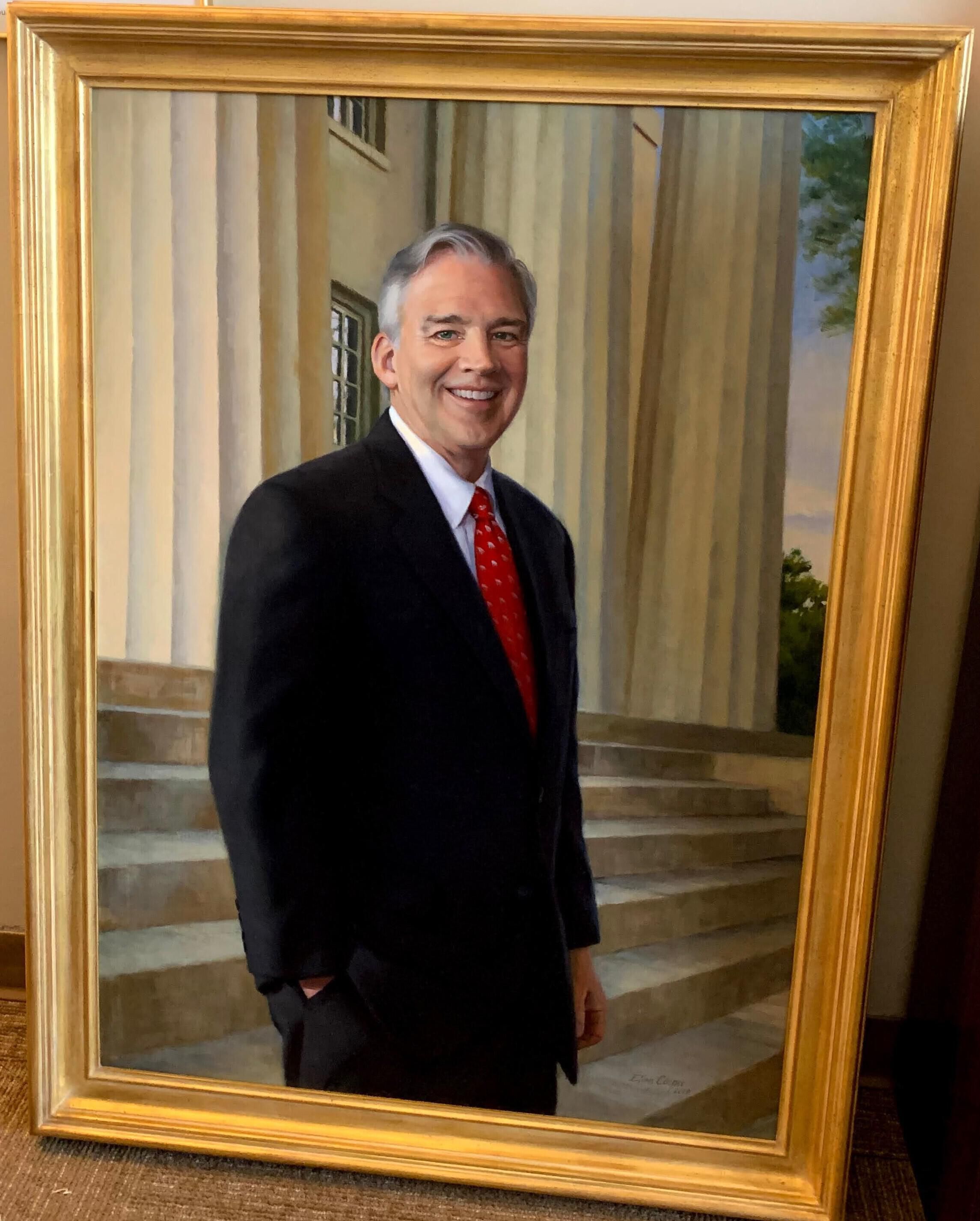 Portrait of Seamus Carey, President of Transylvania from 2014-2019. This is a three quarter length portrait. He stands of the stairs of Old Morrison with the columns in the background.Collection