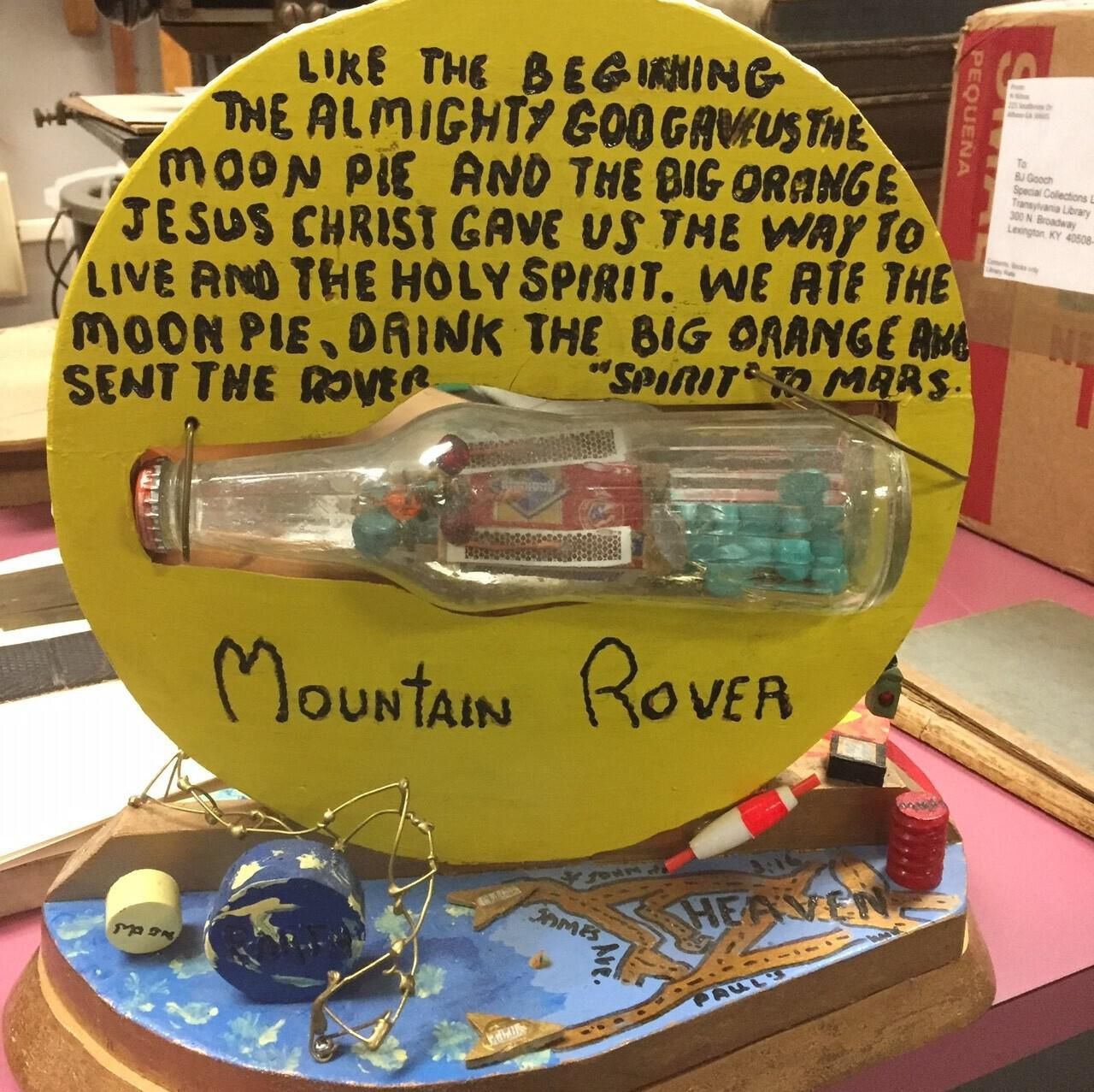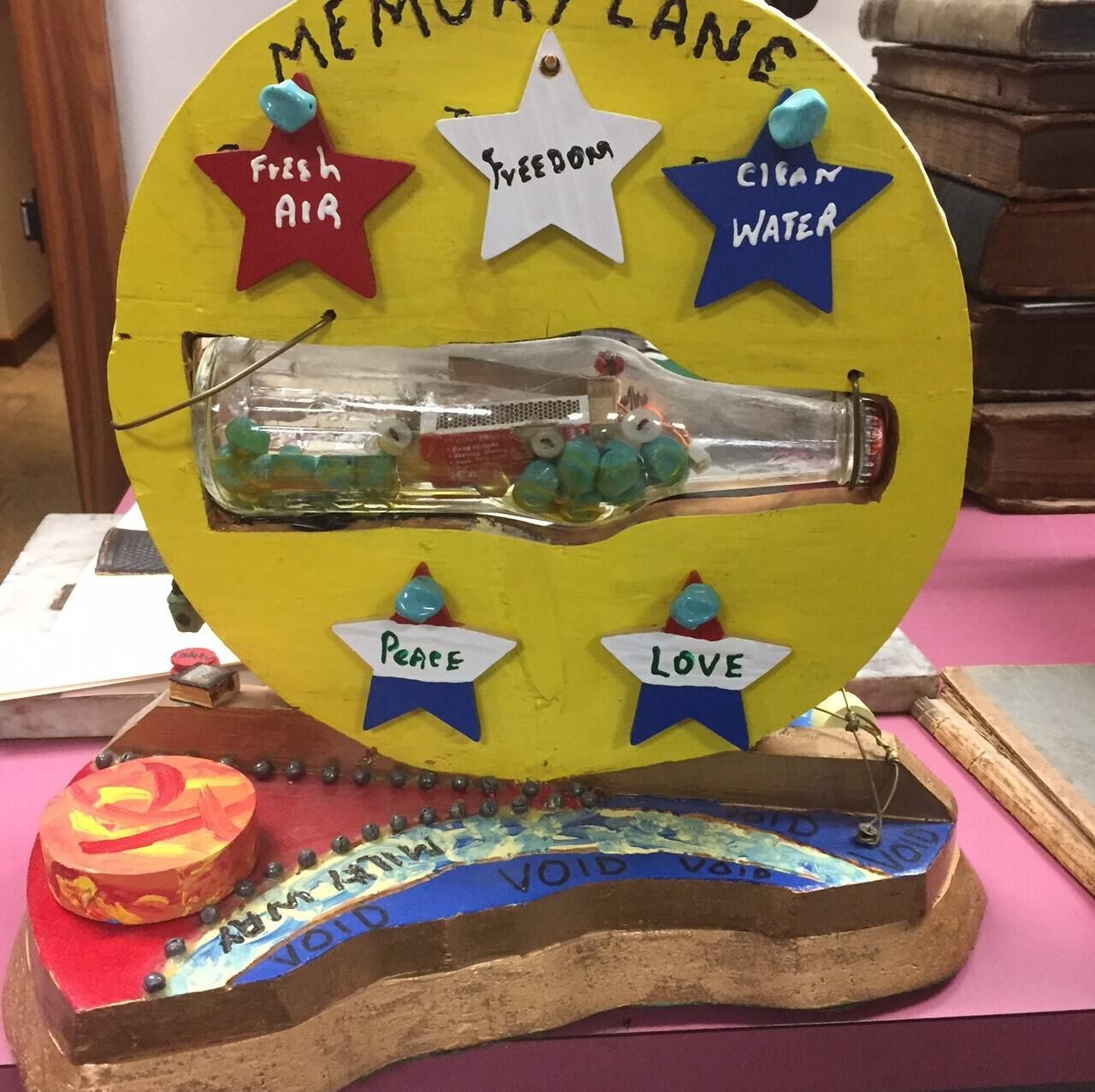 Assemblage of painted plywood, turqiouse beads, coke bottle, matchboxes, fishing float. Depicts a universe. Pieces move including the stars and the round piece painted like flames and reveal words.Collection