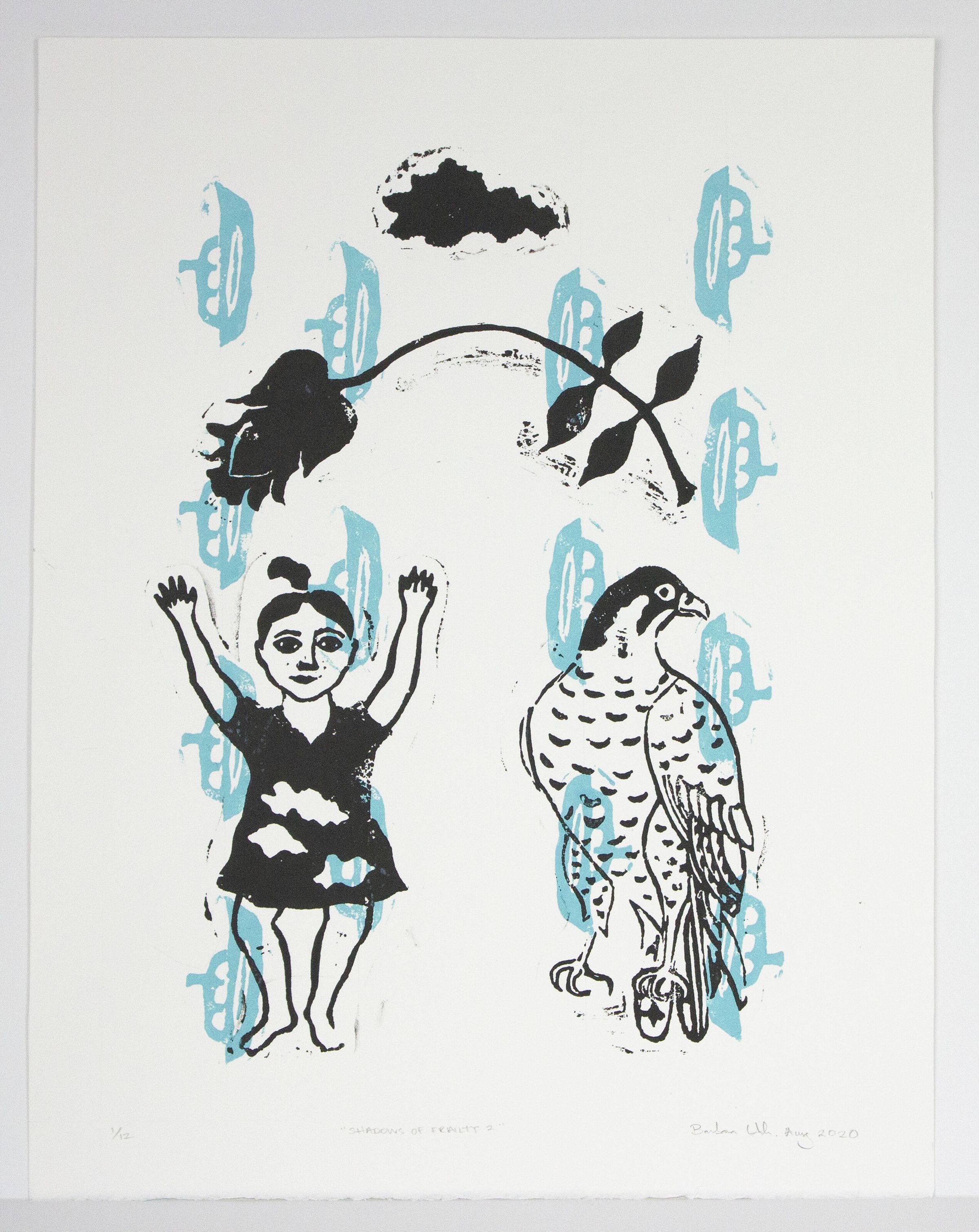 Artist Statement: "I feel the lockdown experience has brought forth such strong differences and divisions. Those of us in good health on the sidelines have to adjust to restrictions and financial pressures and keep our morale strong, while there are thousands, suffering, dying and mourning in their own private hell, and alternately those actively battling on the frontline toil relentlessly with emotional trauma and unsafe conditions, risking their lives to keep the population from peril. The print explores the strength of the spirit in adversity in these challenging times. ‘Shadows of Frailty 2’ looks at our vulnerability in the pandemic; how our feeling of safety is undermined with a common threat to survival and the heightened awareness of our own mortality. The print explores the strength of the spirit in adversity in these challenging times.”Artwork Details