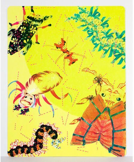 Screenprint with yellow background. Images of insect-like creatures are printed on this in reds oranges and greens. Several of these have children's or babydoll heads. This is print 12/12.