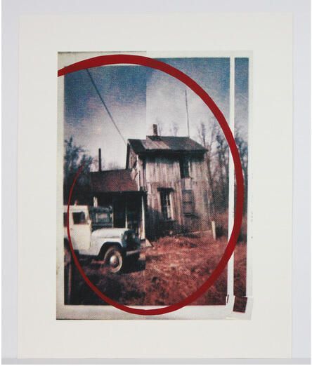 Screenprint of photographic image of jeep and old building set in countryside. Large red semi-circle of color overlays the image. This is print 1/12.