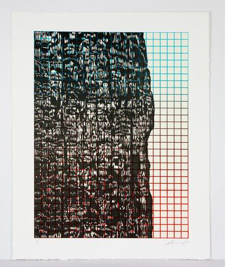 Woodblock and screenprint black inked woodblock print overlays a colored grid that graduated from green to red. This is print 1 of 12.