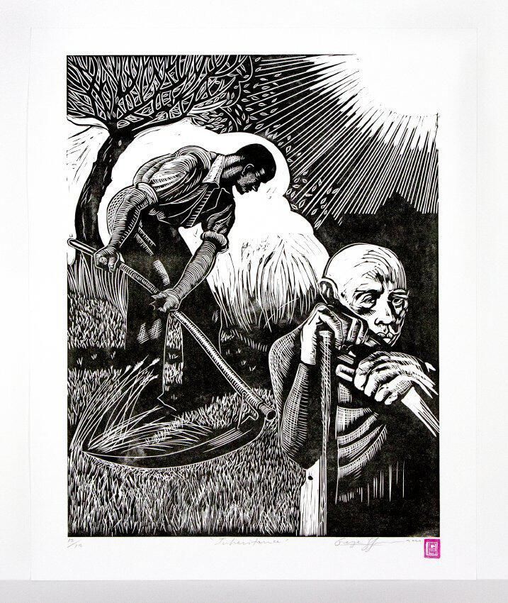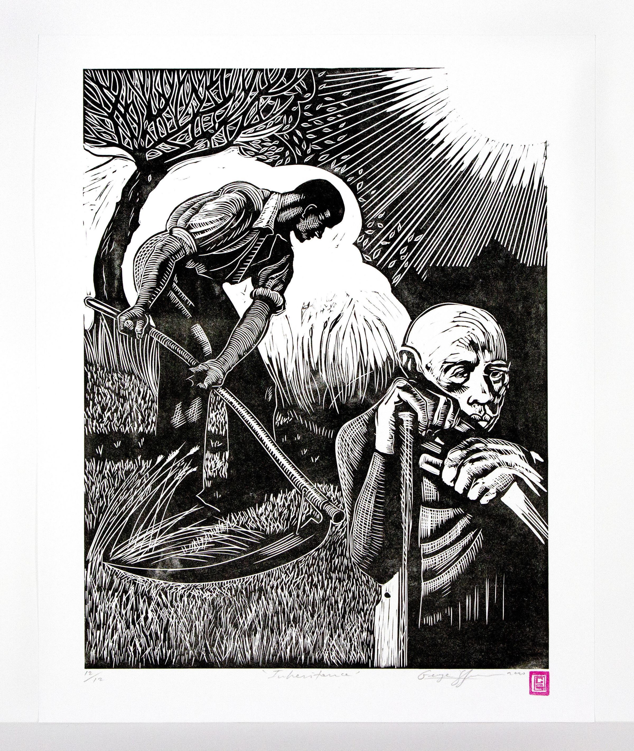 Japanese linocut on masa Japanese 86 GSM paper depicts two men with scythes; one working and one leaning on the scythe. Black and white print. This is print 12 of 12.