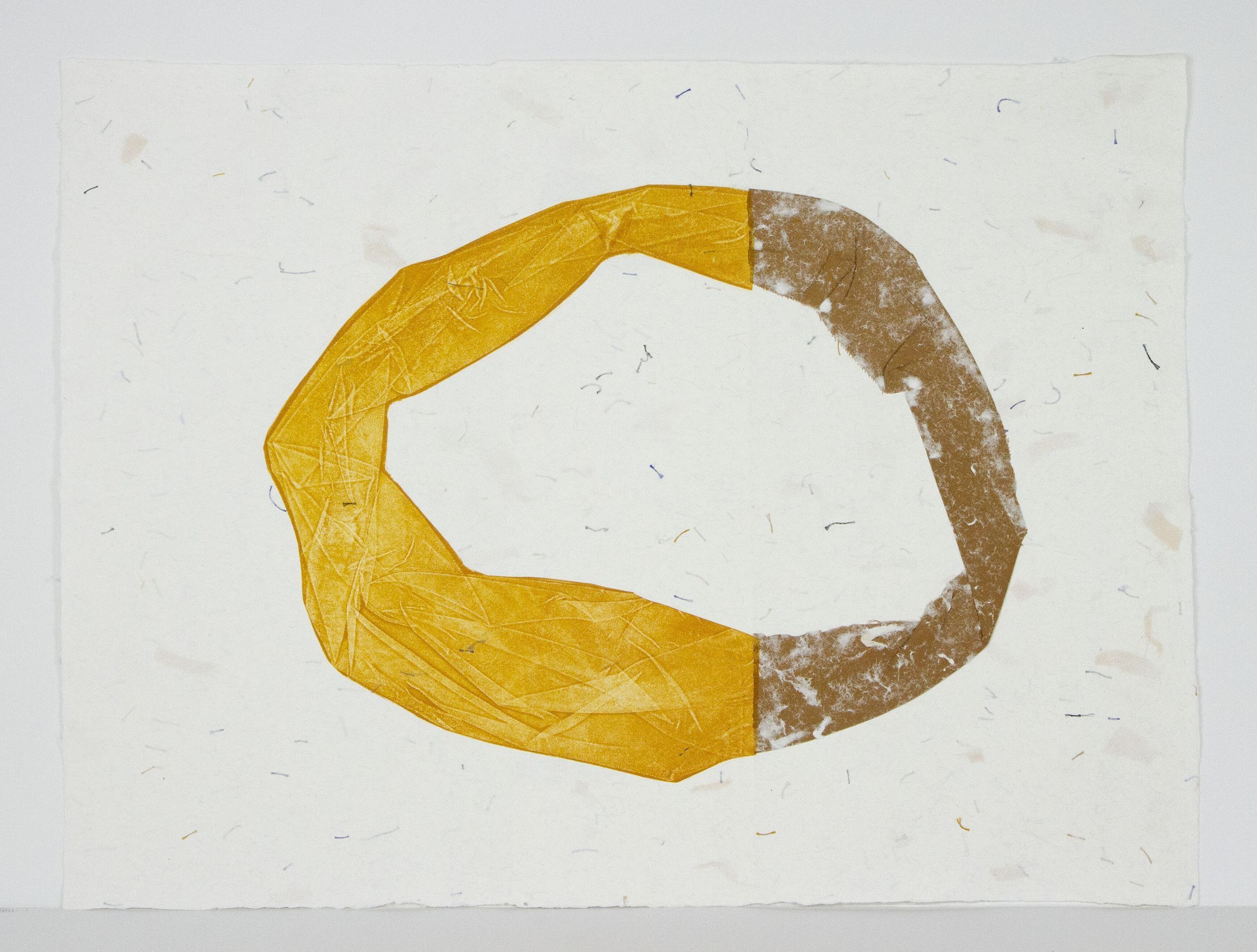 Monoprint on artist made paper with textile inclusions. Depicts a ring of yellow/gold on white background. This is print 1/12.