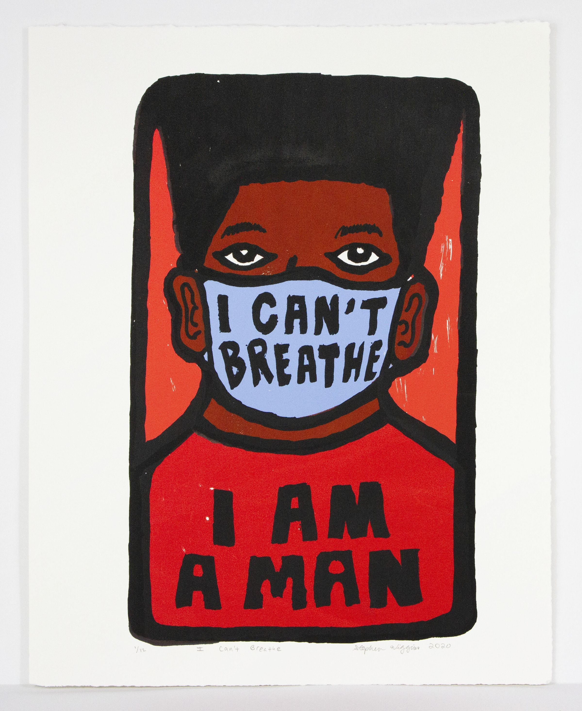 Additional Statement: “This edition of prints shows an image of a person of color wearing a mask with the words “I Can’t Breathe” which is what Eric Garner said while he was being killed by the police. It is a protest change of 2020 due to the deaths of George Floyd and Breonna Taylor. The t-shirt he is wearing says “I am a man” which is from the protest signs from the 1968 Memphis sanitation strike. The two words and phrases are to connect the past and present and how we are near to the problem but very far from the solution. It has been so long and we are still dealing with the same problems.”Collection