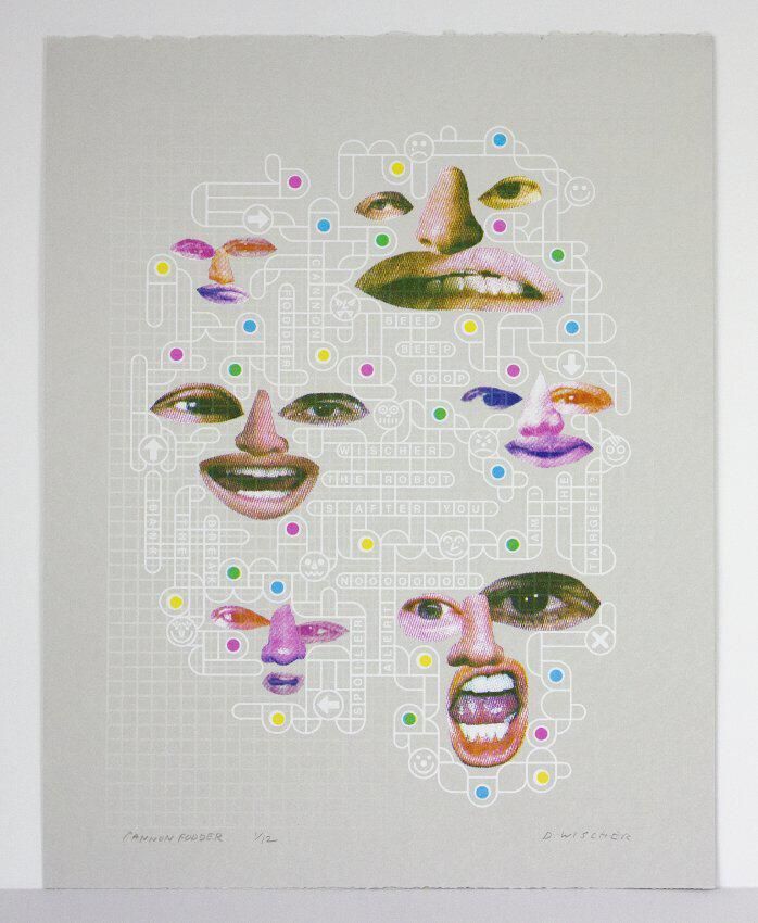 This screenprint with varnish depicts deconstructed faces overlaying a game board line design. Made by a Kentucky artist. This is print 1 of 12.