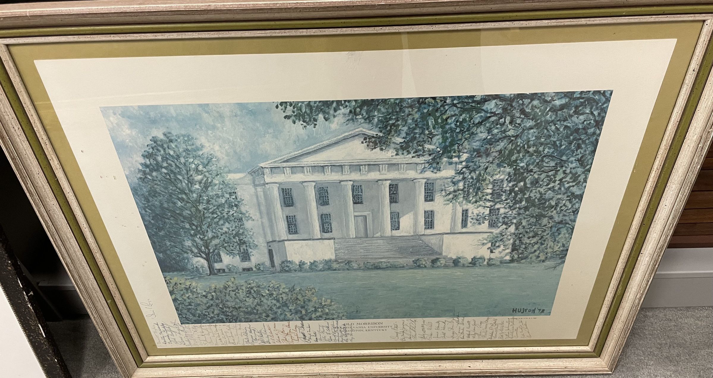 Print of a drawing, possibly a pastel, of Old Morrison. Includes signatures of multiple people across the bottom of the print, including Irving Lunger, former president of TU. Print may have been issued in celebration of the reopening of Morrison after the 1969 fire that destroyed the interior.