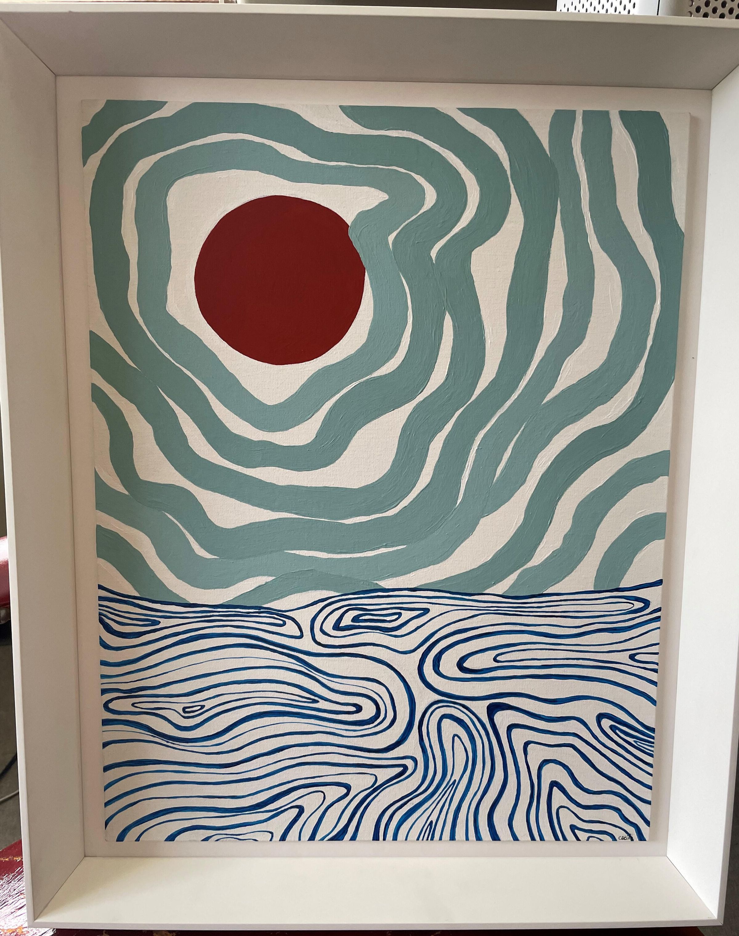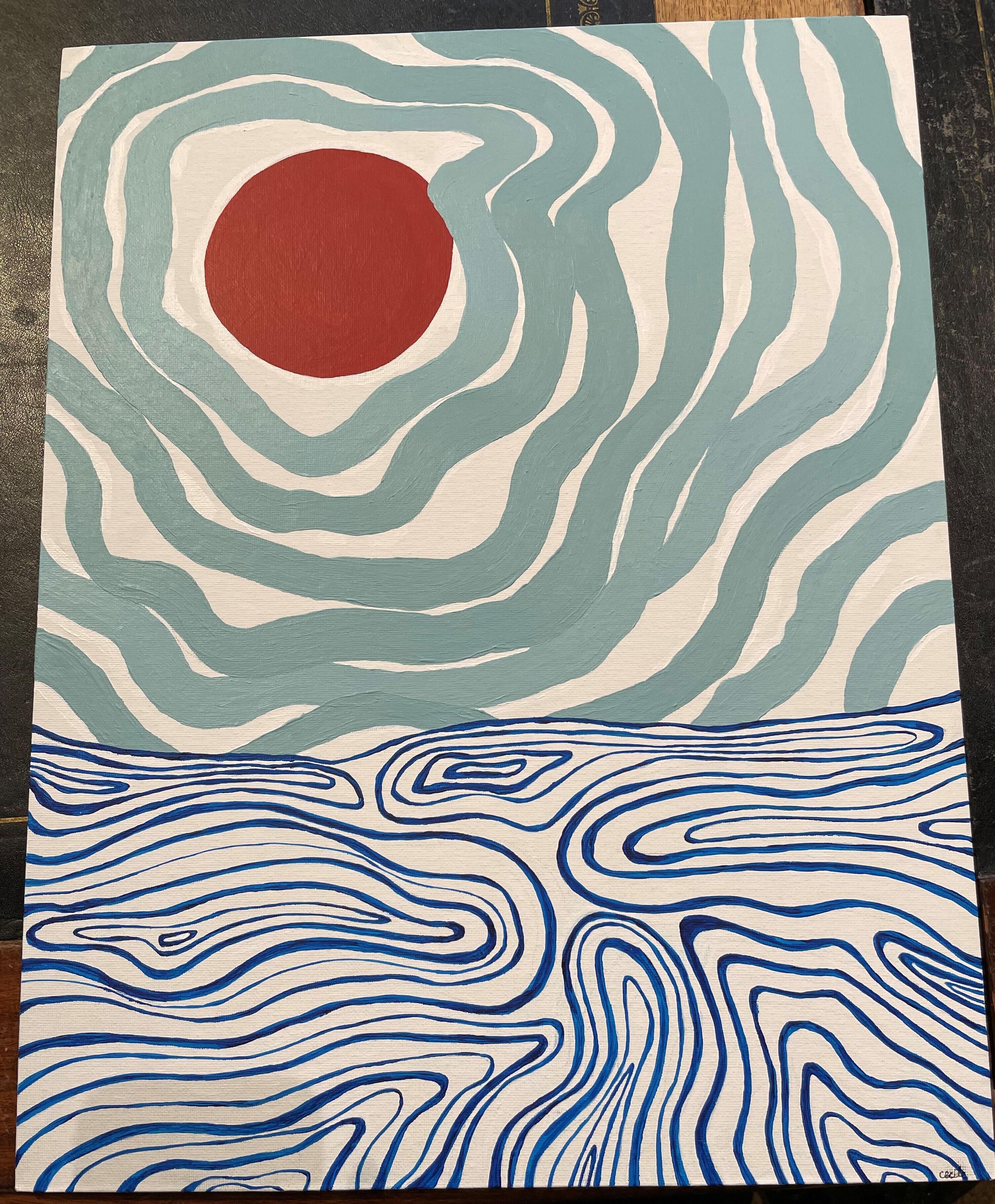 Painting created in 2021 by Transylvania student Cecile Tijou. Red circle sun surrounded by blue wavy lines on a white background. Lines are reminiscent of contour lines on a map.Collection
