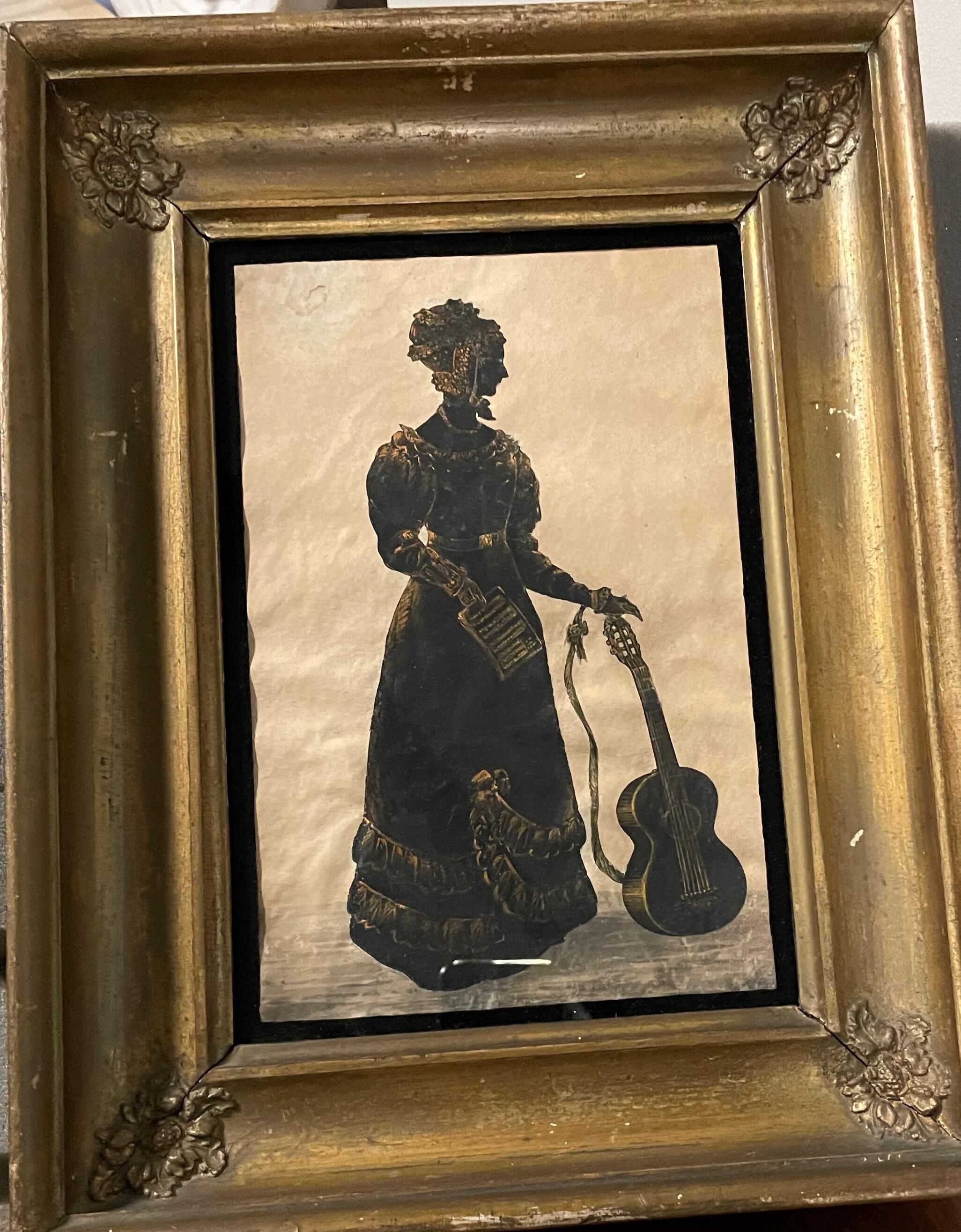 Profilographs are similar to silhouettes. This profilograph of Mary Austin Holley was created in the 19th century. It is part of the Holley Manuscript Collection (MSC14). It depicts an image of Mary Austin Holley in a bonnet, holding a piece of music and a guitar.