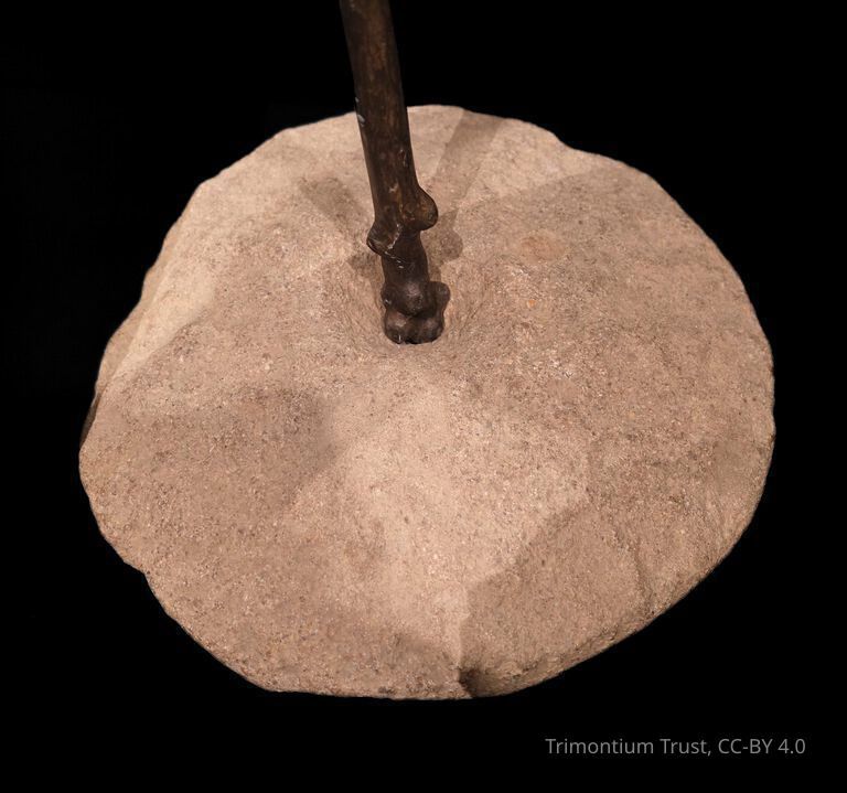 Numerous quernstones were found on the site, the most popular being those made of Niedermendig basalt lava probably imported from the Rhine, however this quernstone was made of millstone grit. Jame's Curle notes in his book that all of the quernstones were frequently found at the bottom of the rubbish pits. The iron spindle is mostly intact.
