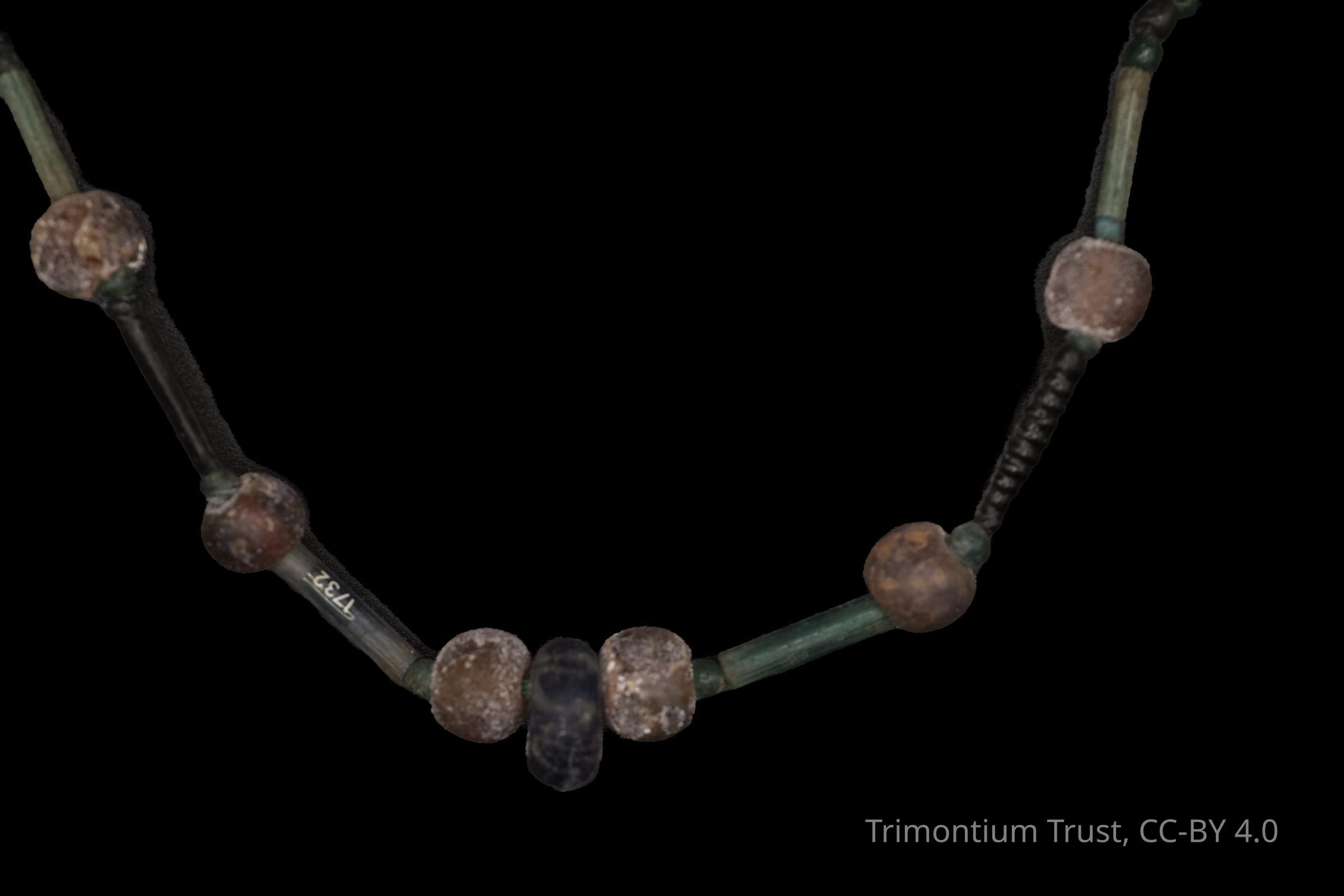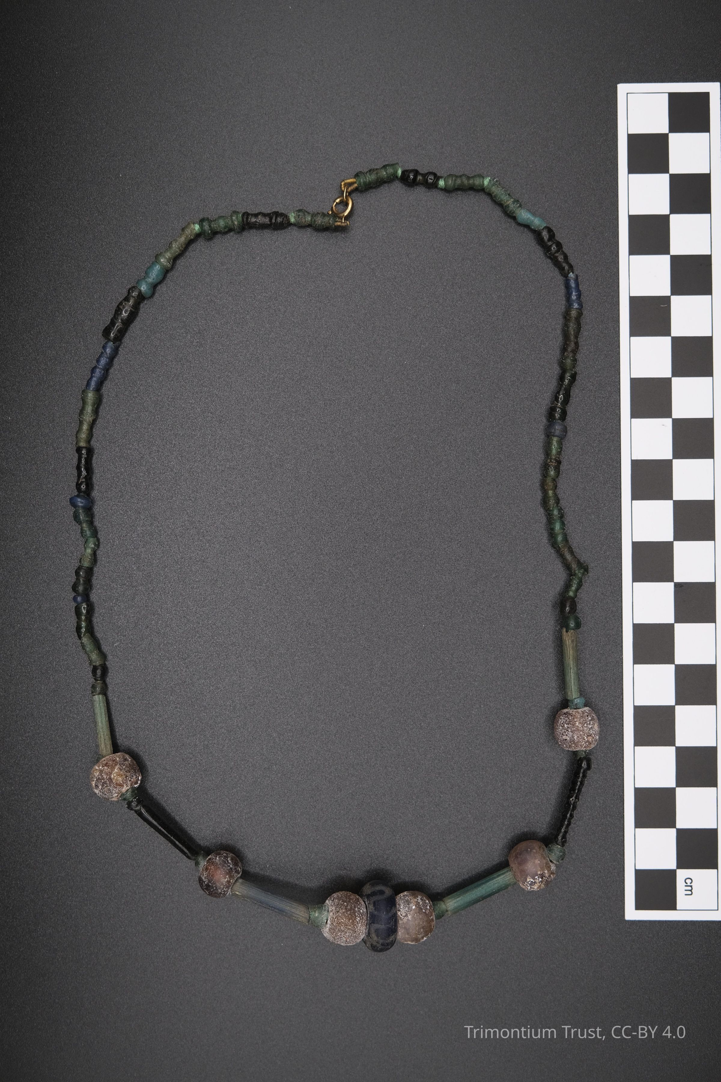 Romano-British glass beads on a restrung necklace: 6 plain brown beads and 1 blue bead with white swirl decoration. From the Romano-Celtic temple site of c 300 AD at Lamyatt Beacon (Somerset). Hattat Collection. Part of the Anstey Collection.