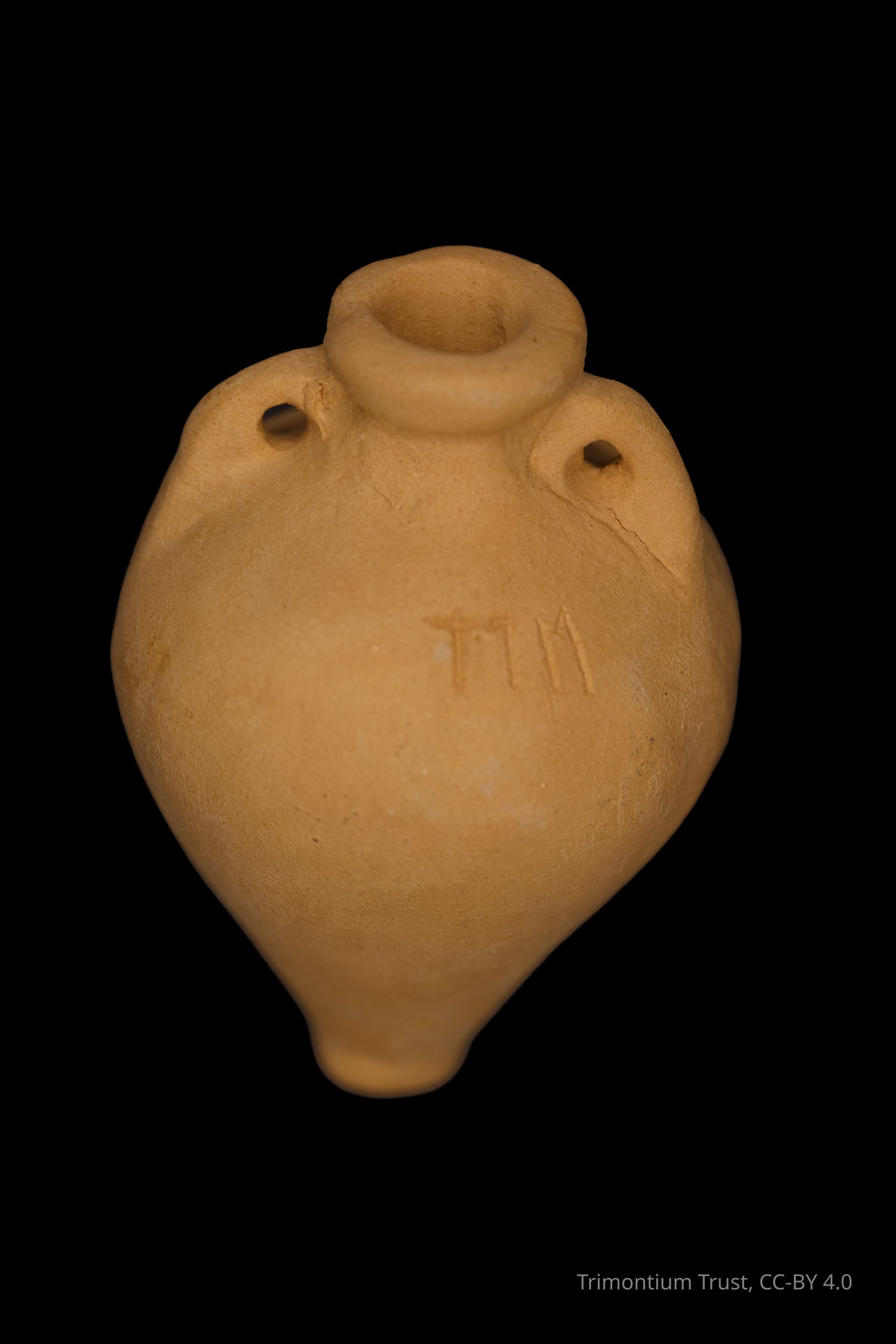 Replica minitature amphora with two handles and 'TTM' engraved into outer surface.