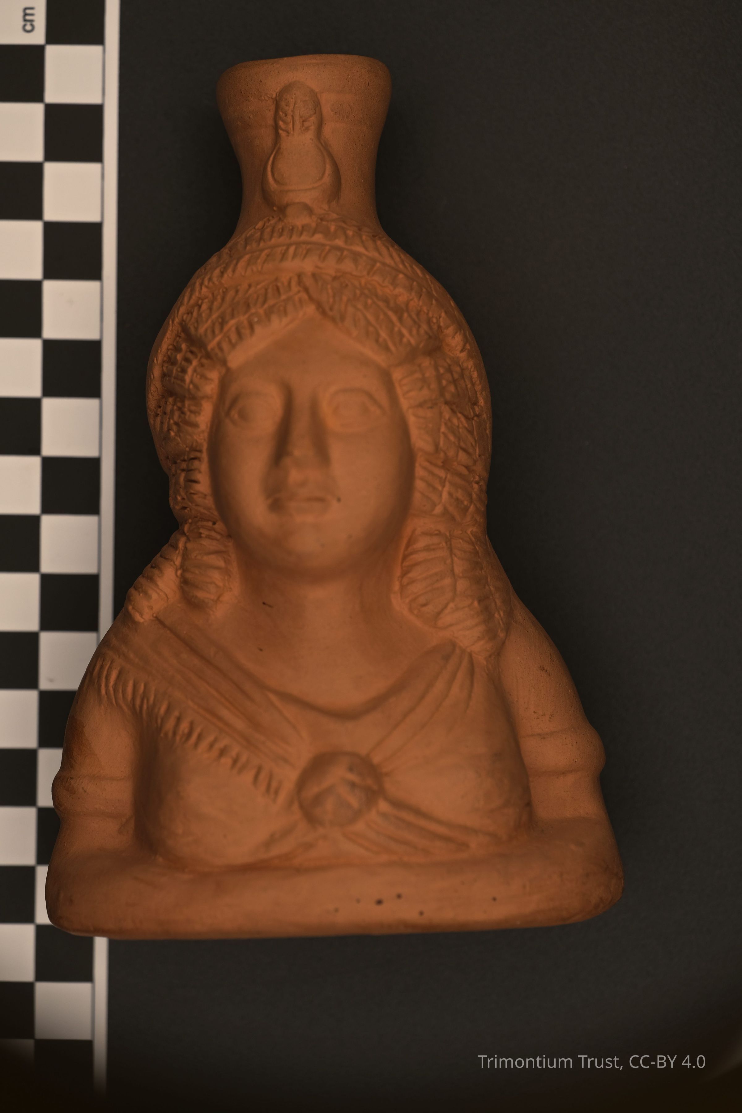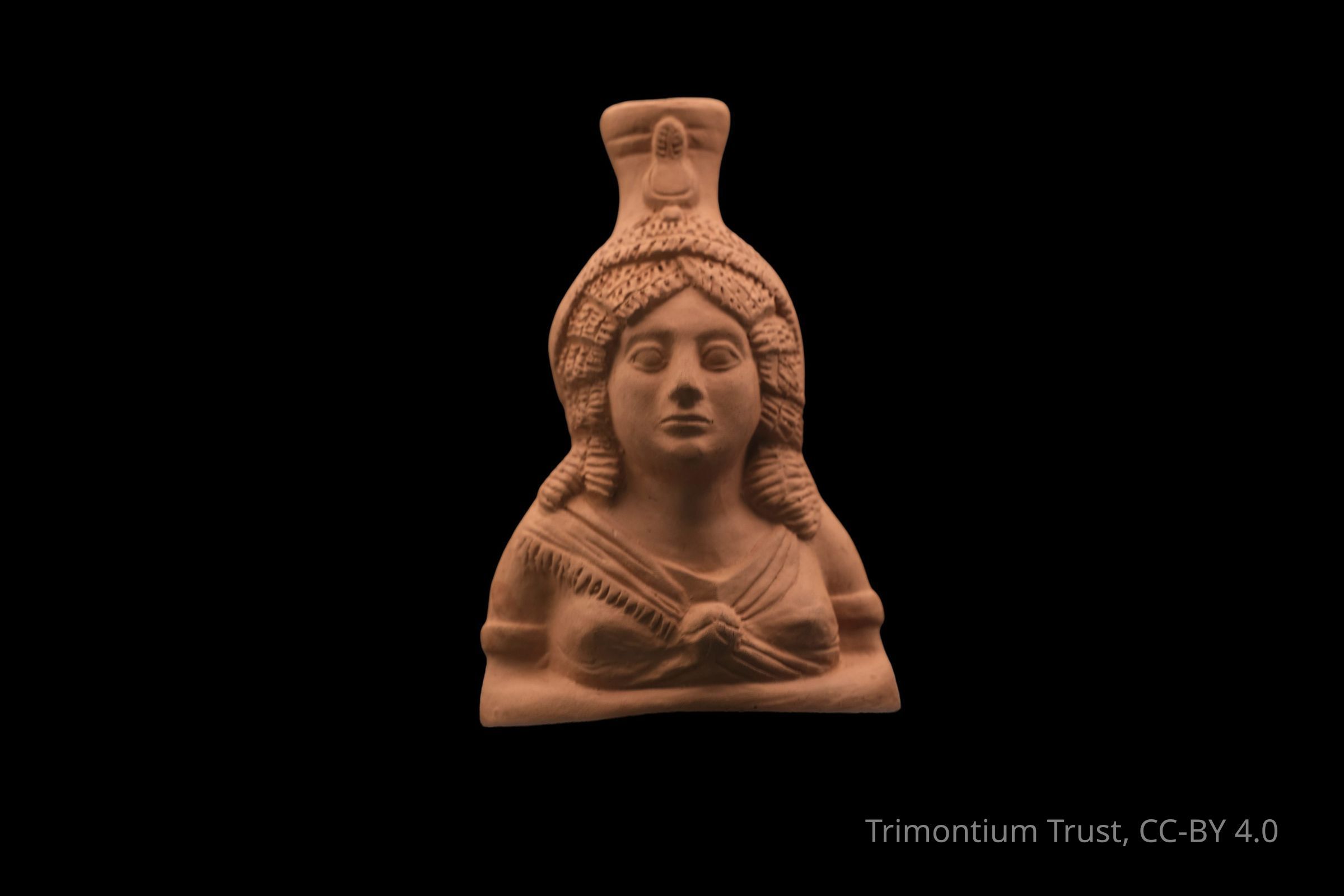 Replica pot with face of woman wearing dress with shawl draping from right shoulder. Feather headdress. Traces of black paint splatter to surface.