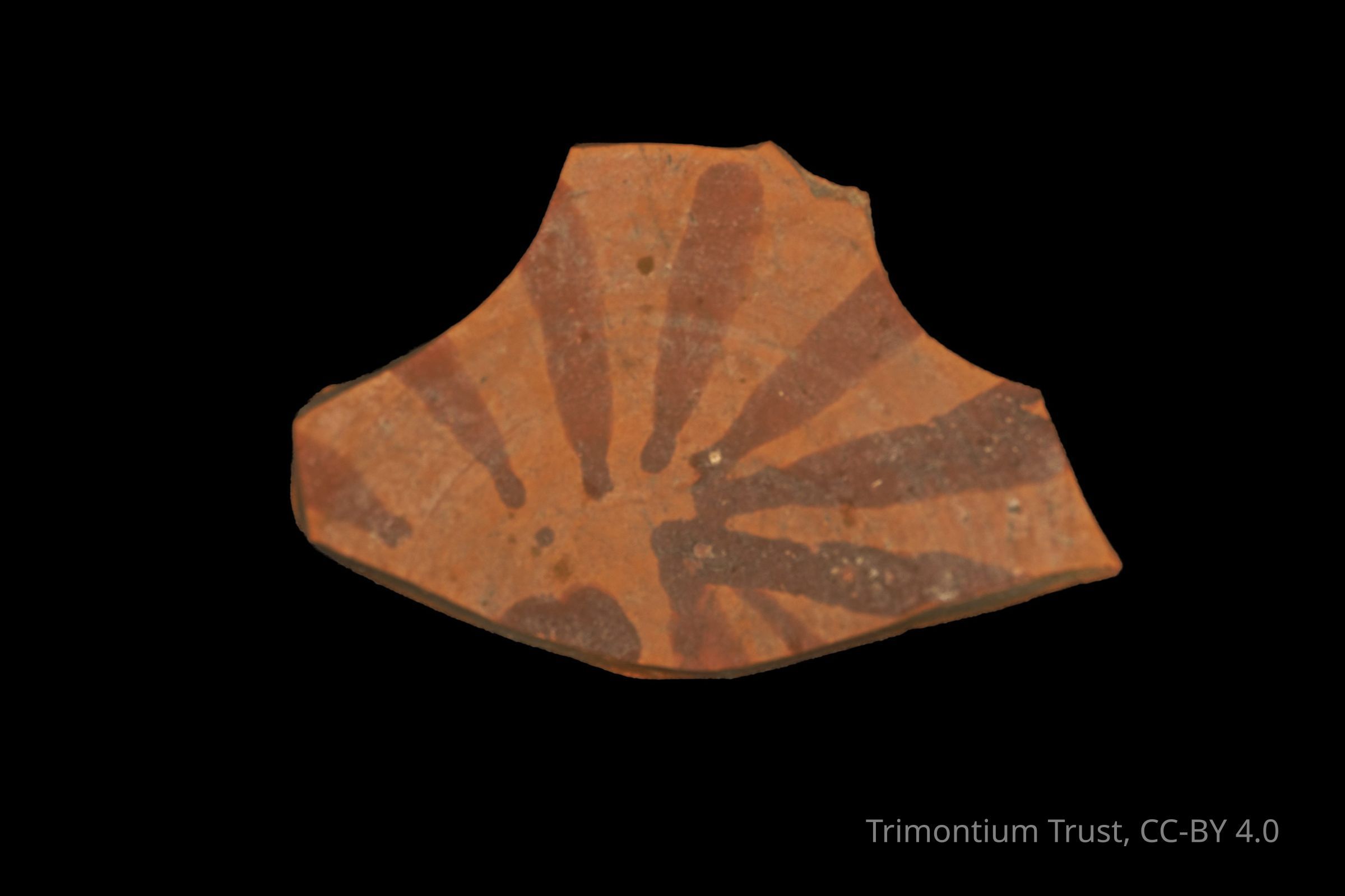 Terracotta pottery sherd with brown line decoration. Part of the Anstey Collection.