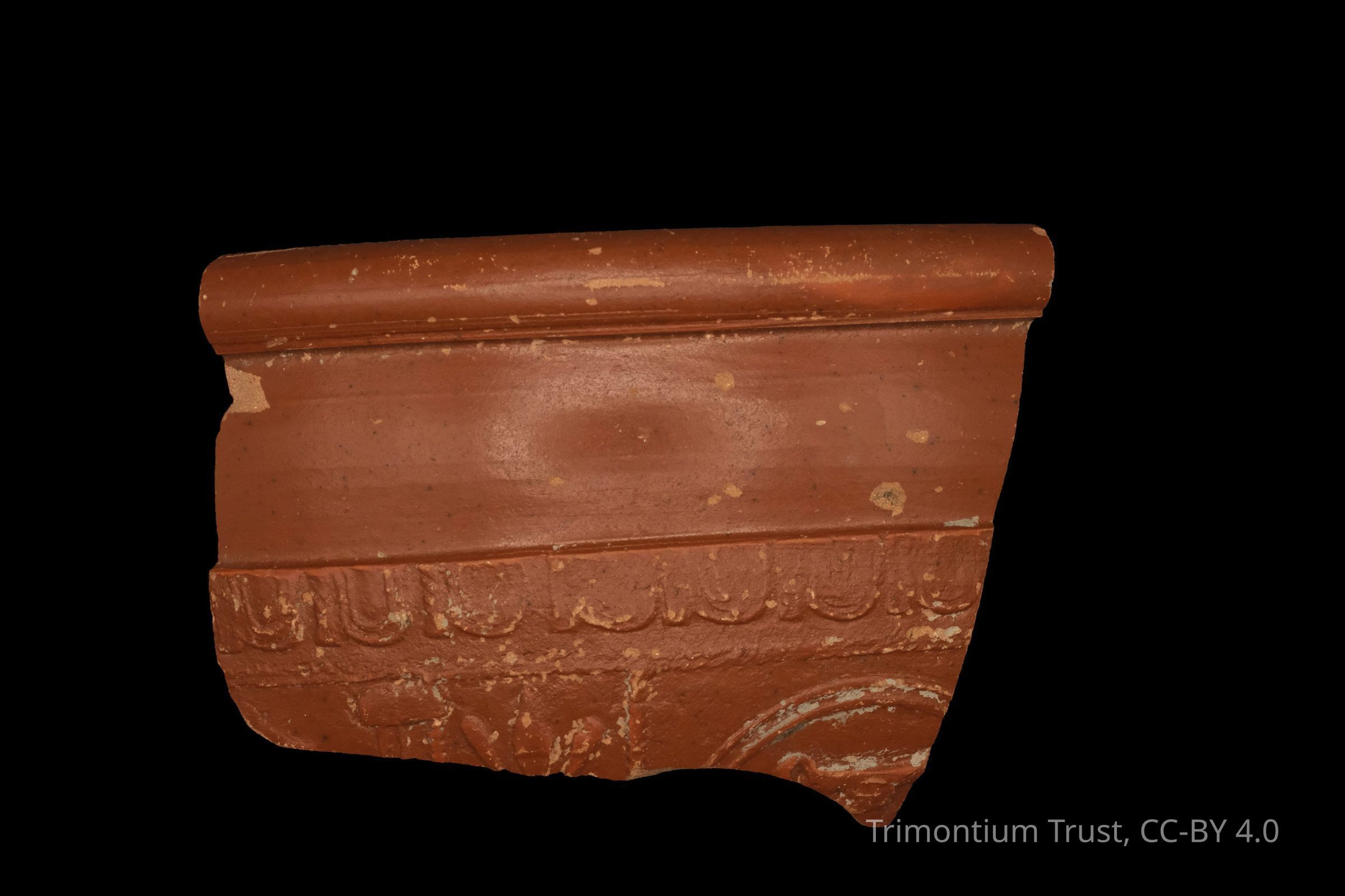 Samian rim fragment with geometric border pattern and leaf decoration.