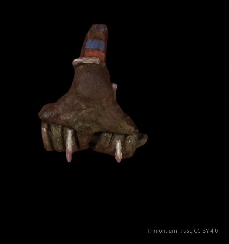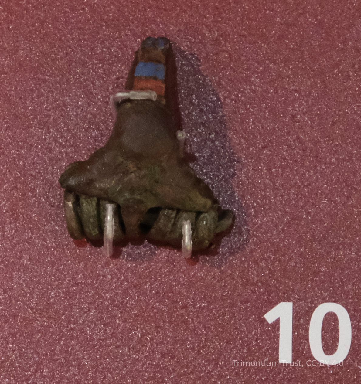 Roman copper-alloy headstud brooch with red and blue enameling.