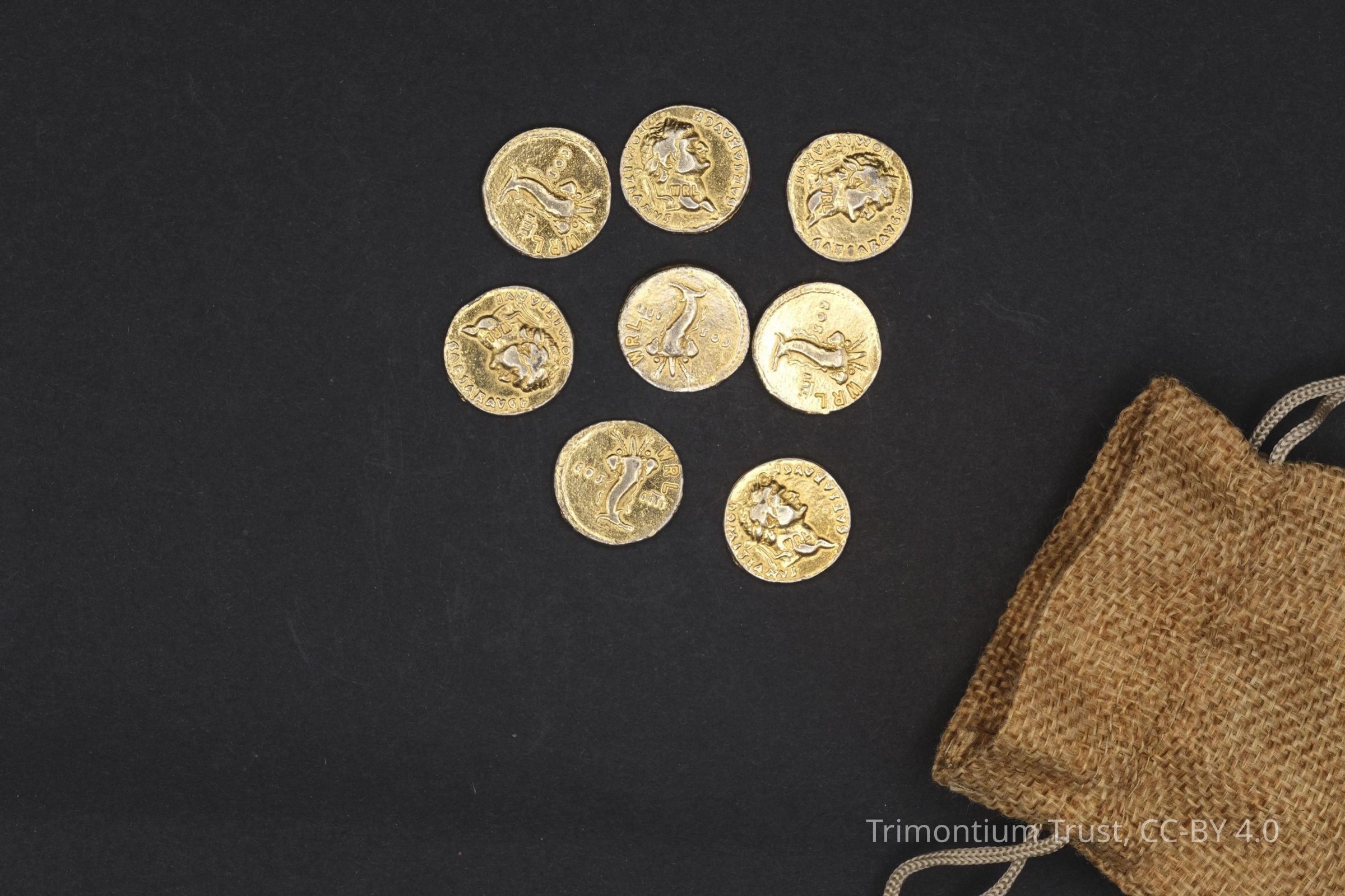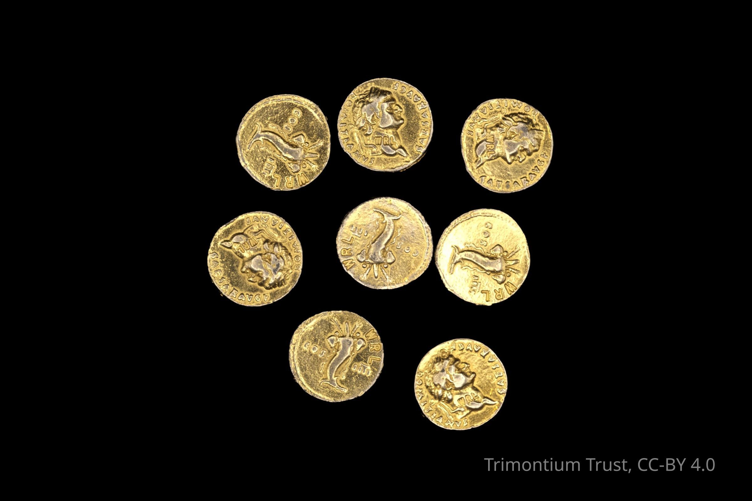 8 replica gold aureus coins of Domitian. Right facing portrait of Domitian on obverse with words 'DOMITIANUS, CAESAR AVG' around border and 'WRL' on portrait neck. Reverse depicts cornucopia (?) with 'COS IIII' and 'WRL'.
