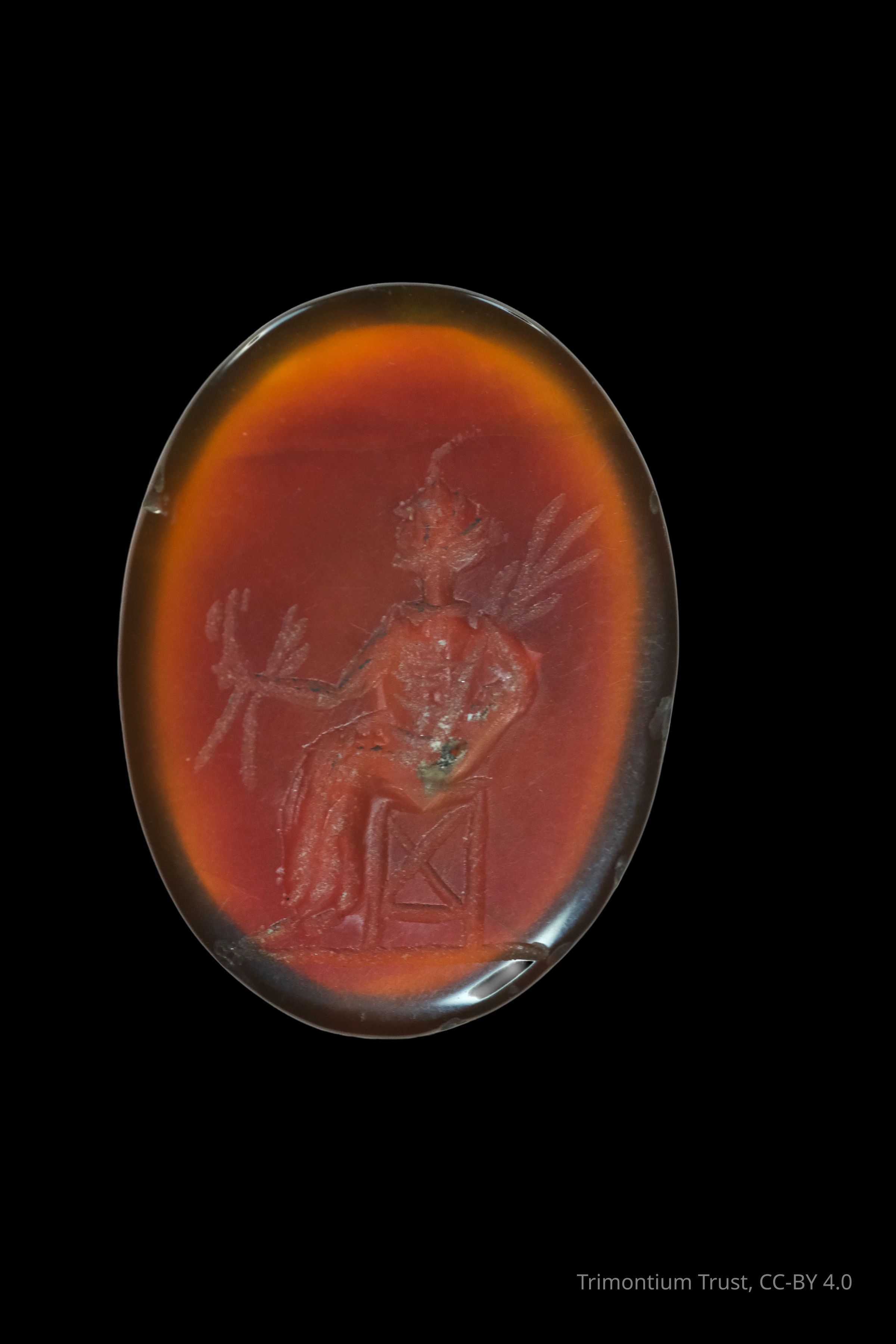 Replica brown-red intaglio with carved seated figure holding sheaths of wheat.