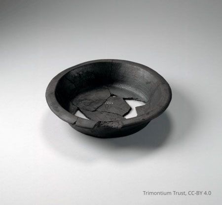 Black burnished ware dish with overhanging rim, lattice decoration on sides and zigzag on bottom, from the Roman site at Newstead (Trimontium), 140 - 180 AD