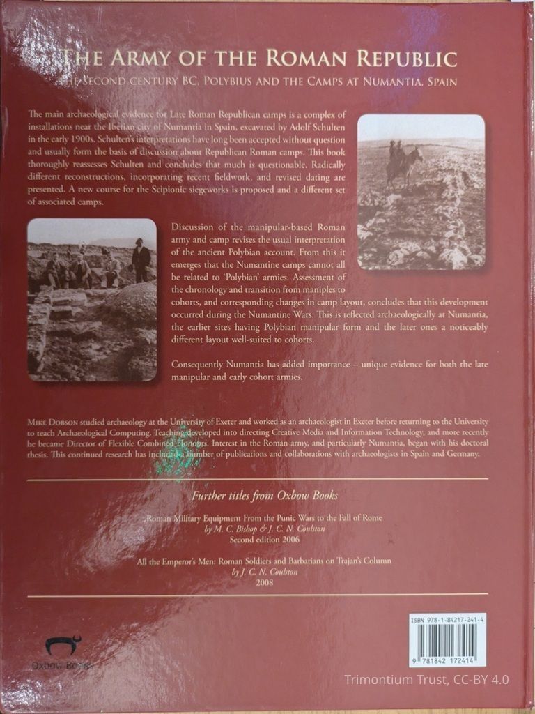 The main source of archaeological evidence for Late Roman Republican camps is a complex of installations around the Iberian city of Numantia in Spain, excavated by Adolf Schulten in the early 1900s. The Army of the Roman Republic reassesses Schulten and concludes that much of his interpretation is questionable. Radically different alternative reconstructions making use of recent fieldwork are presented for several of the sites. A discussion of dating evidence leads to alternative dates being offered for some of the camps. To aid interpreting the sites, army organisation and art of encampment for the period of the Numantine Wars is discussed. This study gives added importance to the sites at Numantia, for they not only form the main source of archaeological evidence for Late Republican camps, but provide evidence for the form of camp for both the late manipular army and the early cohort one.Lexicon
