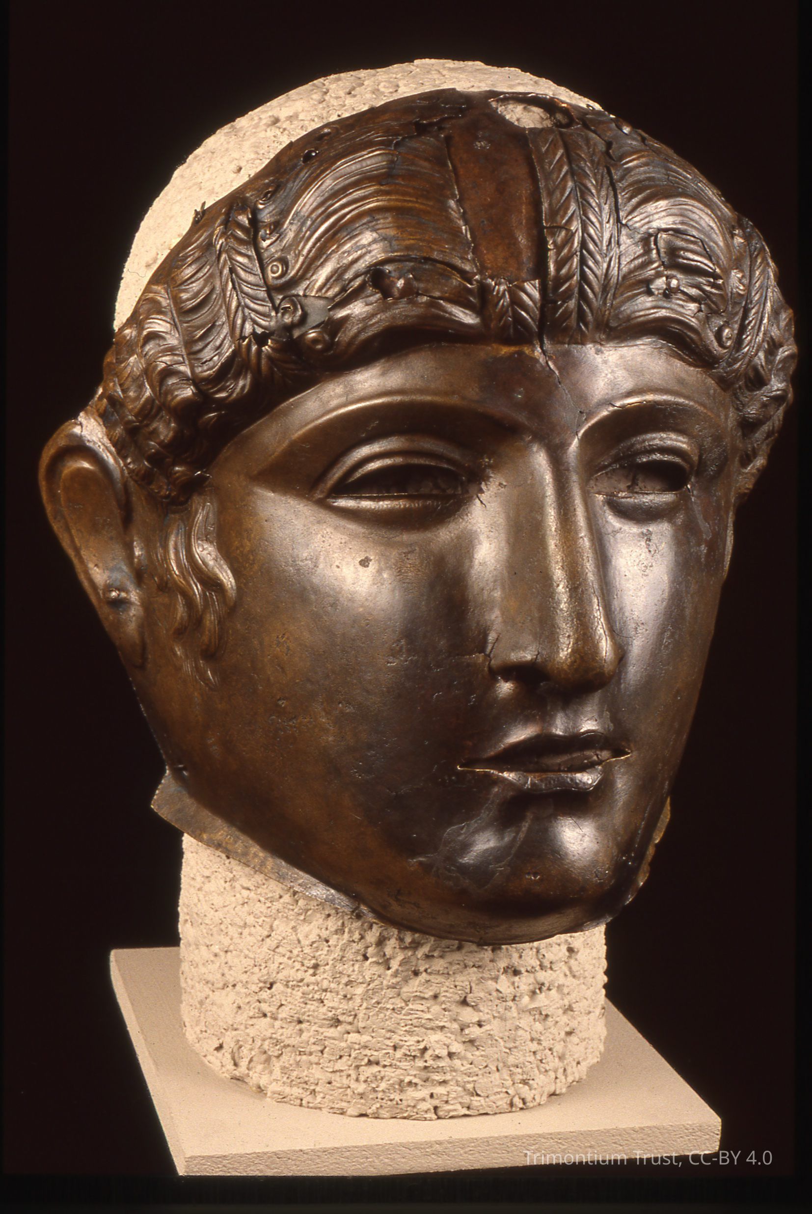 Bronze parade face mask of a young female face, from the Roman site at Newstead (Trimontium), late 1st century ADContext