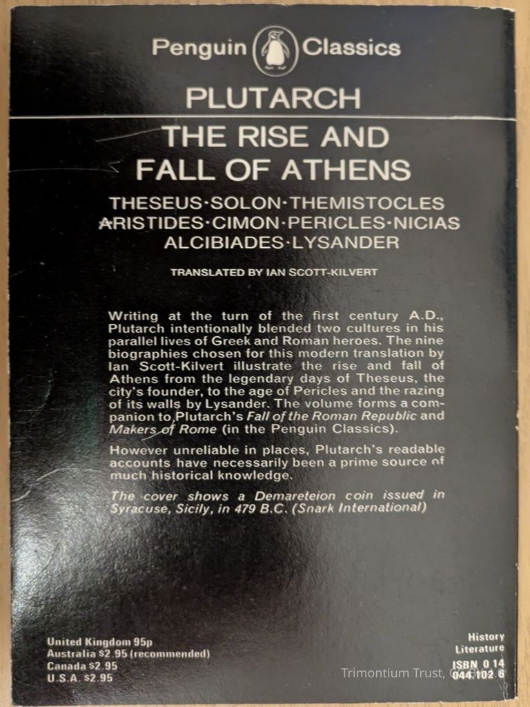 Writing at the turn of the first century A.D., Plutarch intentionally blended two cultures in his parallel lives of Greek and Roman heroes. The nine lives of Theseus, Solon, Themistocles, Aristides, Cimon, Pericles, Nicias, Alcibiades, Lysander, illustrate the rise and fall of Athens from the legendary days of Theseus, the city's founder, to the age of Pericles and the razing of its walls by Lysander. The volume forms a companion to, Plutarch's "Fall of the Roman Republic" and "Makers of Rome" Penguin Classics. However unreliable in places, Plutarch's readable accounts have necessarily been a prime source of much historical knowledge.Context