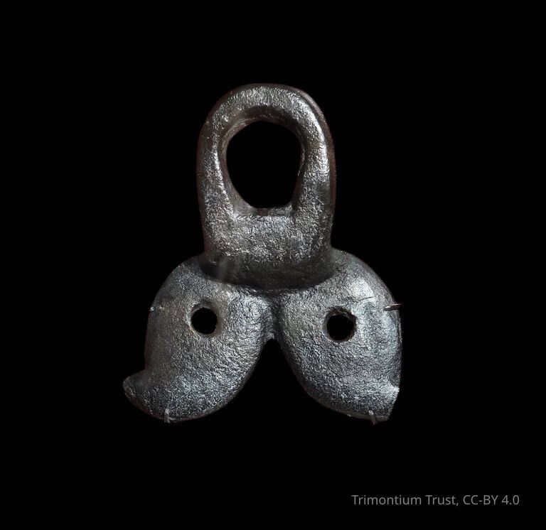 One of a pair of massive bronze loops, with fish-tail end and perforated segments, from the Roman site at Newstead, Roxburghshire, 80 - 180 AD. Handle fittings from a massive wooden storage vessel.Use