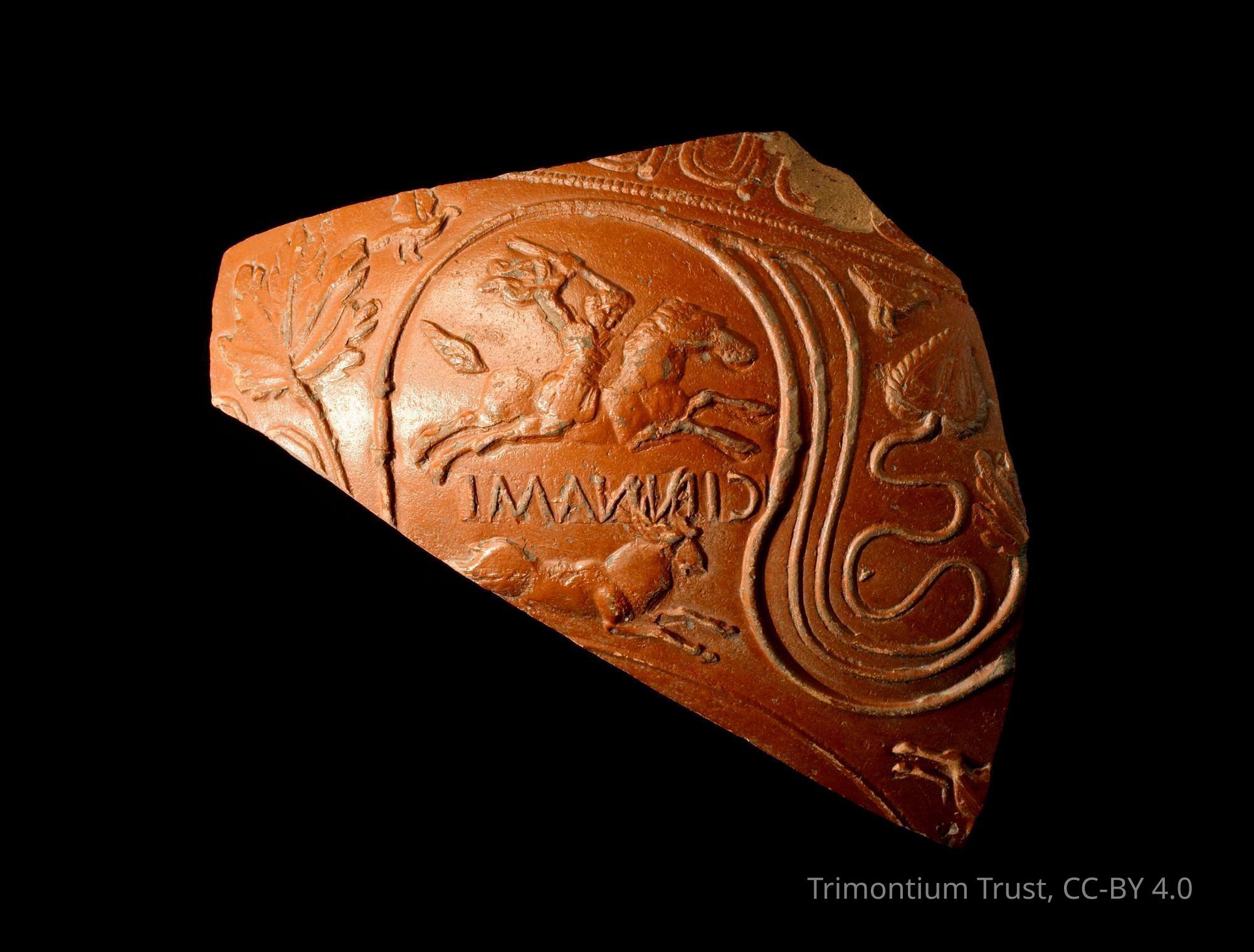 Fragment of a bowl of Samian ware decorated with a man hunting a stag, stamped to indicate manufacturer, from the Roman site at Newstead (Trimontium), 140 - 180 ADUse