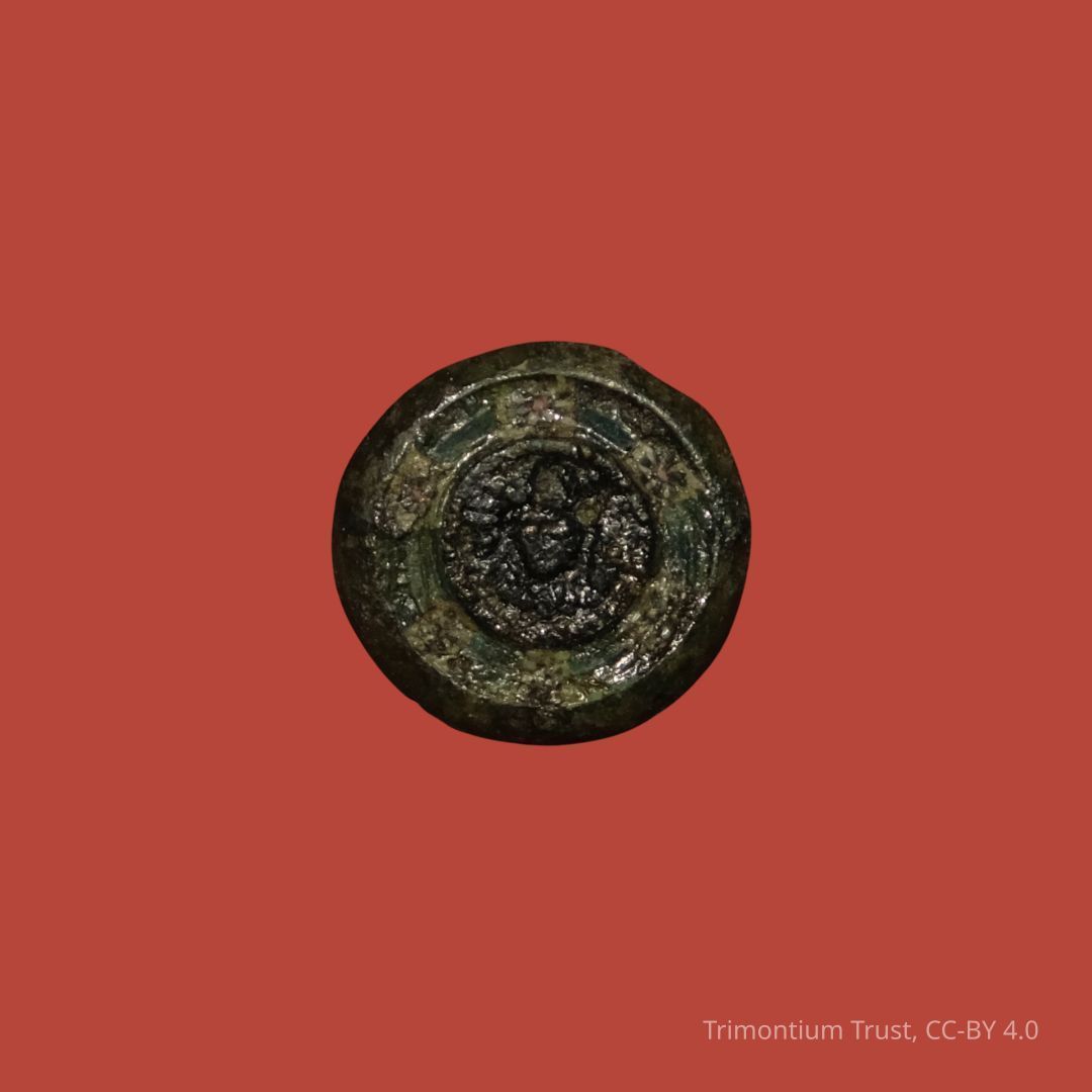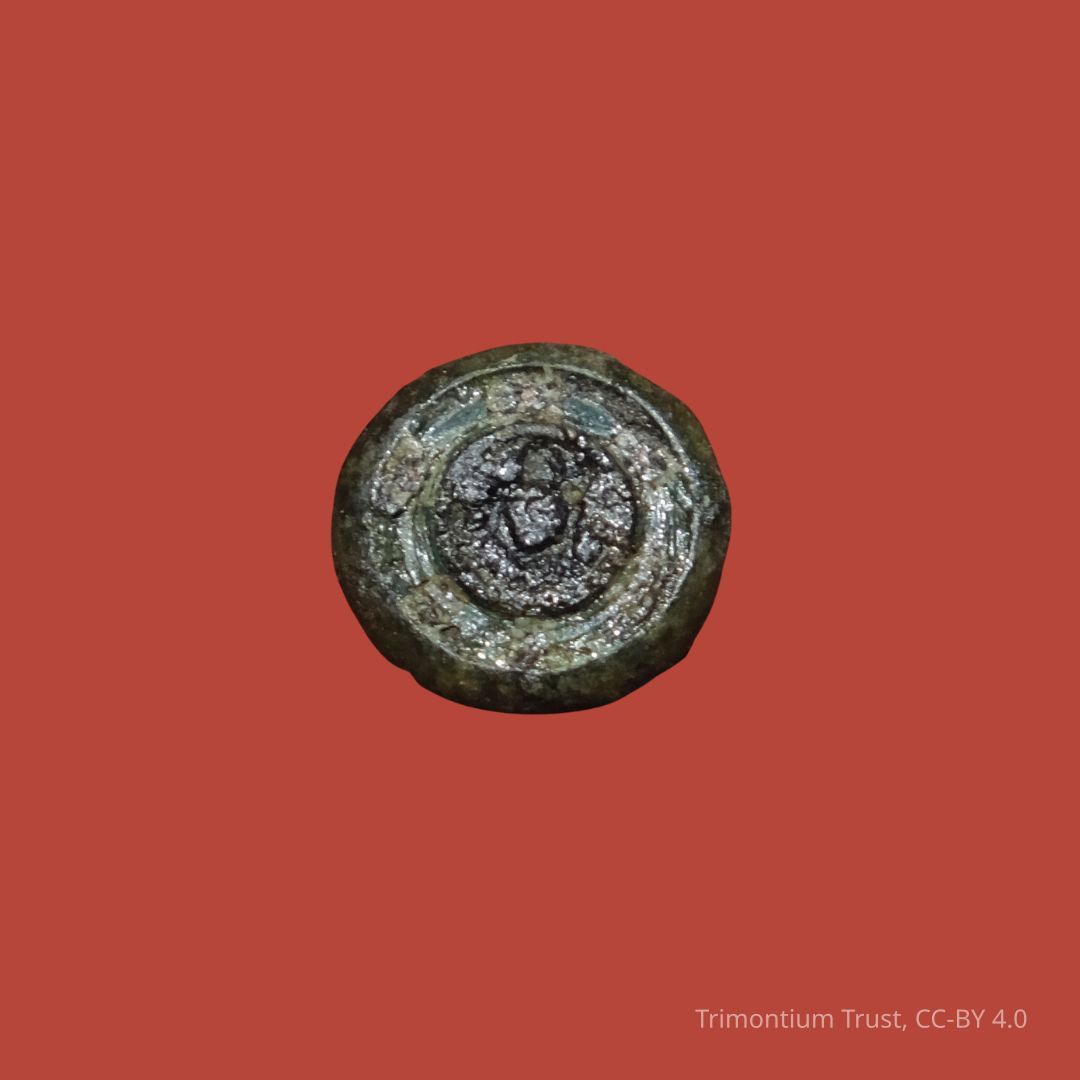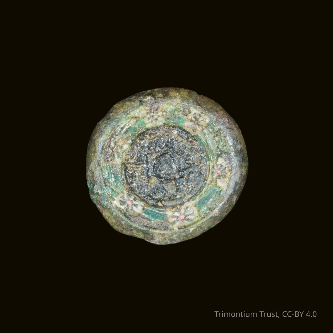 "Found in the Baths. Round the centre, from which the ornament has disappeared, runs a band of enamel, divided into patches alternately (lark-green and white). Each of the white patches contains a small dark blue flower with a red heart. The tang on the back is preserved." - J. Curle