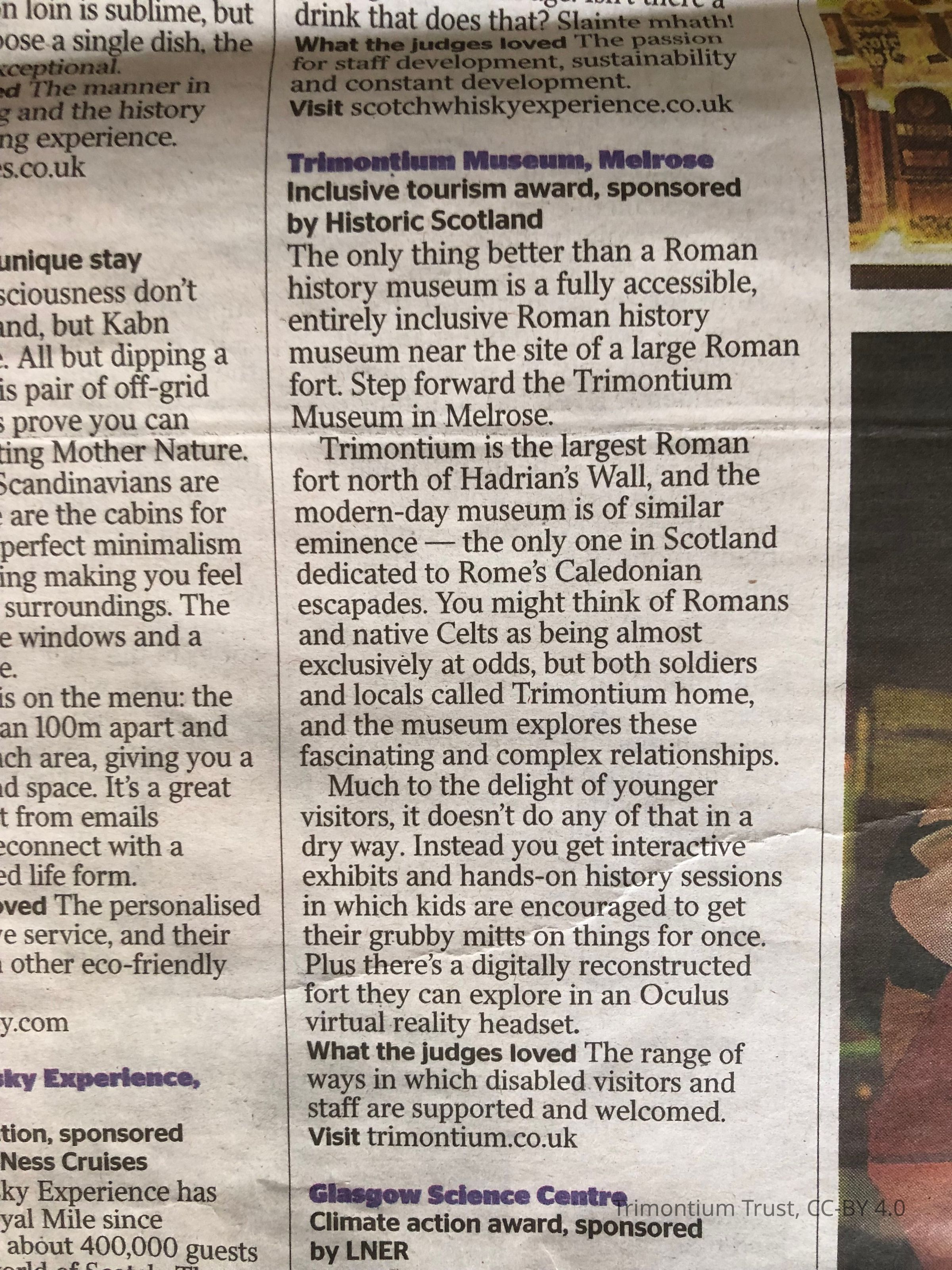 An excerpt of an article in the Times regarding the Scottish Thistle Awards 2024 describing the win for the Trimontium Museum in the Inclusive Tourism Award.Publication Details
