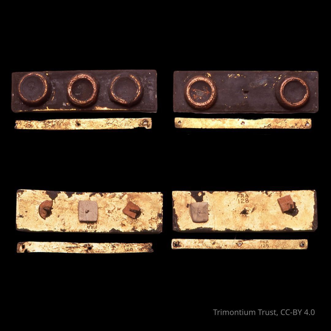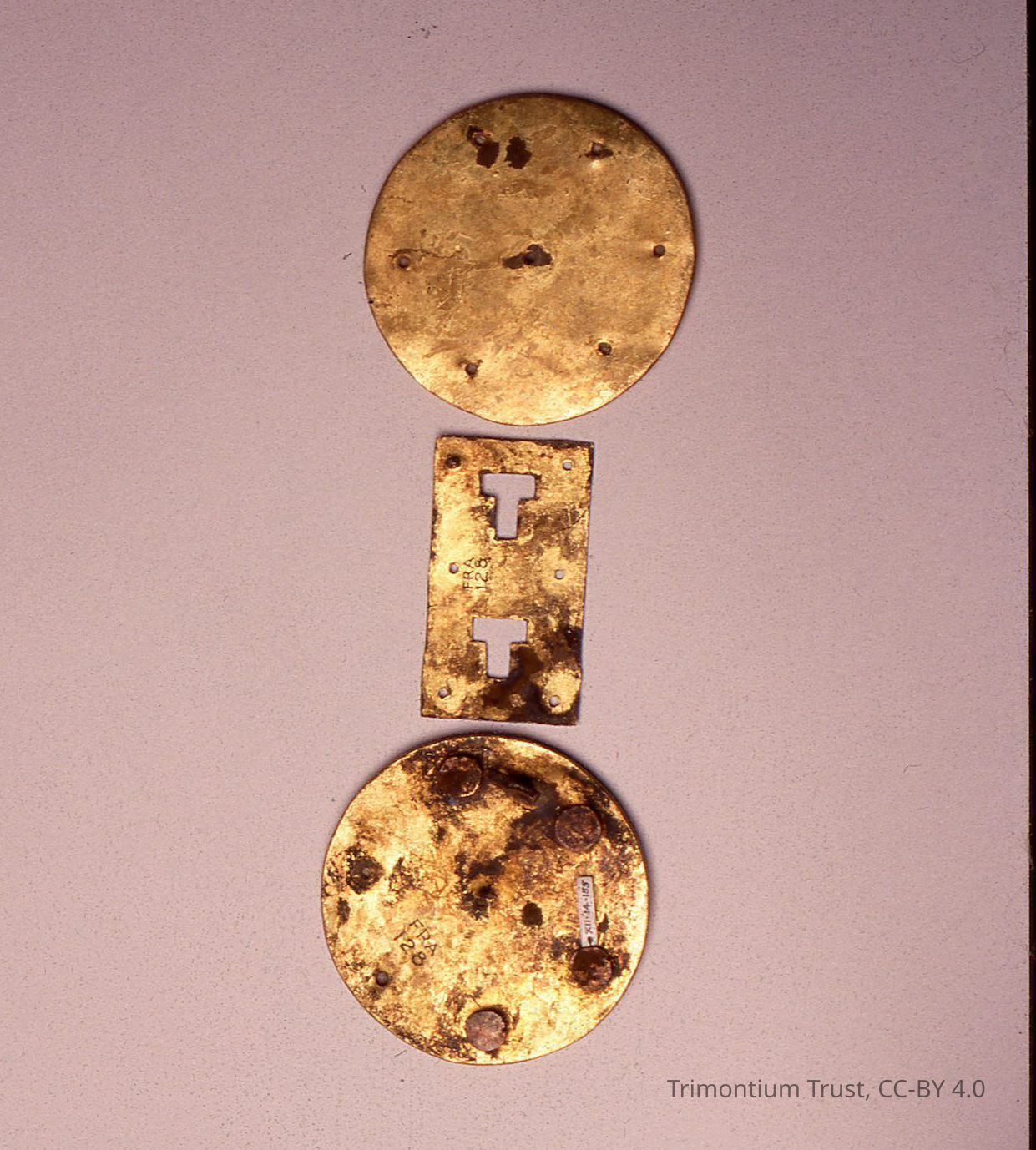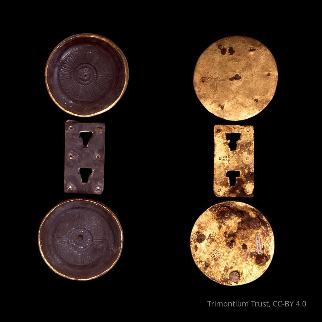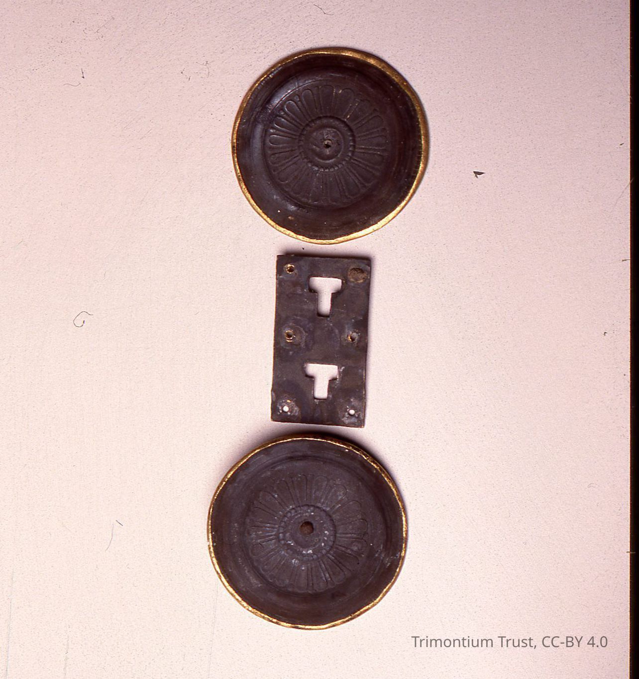 Two circular plates with a rosette embossed in the centre silver plated; one has a T-Shaped catch of copper that matches the T-Shaped slots in the small rectangular plate; these form the terminals of a leather girdle. The other two rectangular plates were fastened to the belt each by 3 studs. Four laminae of thin brass which would have been inserted in the belt to stiffen it. 100 studs of different shapes and sizes.