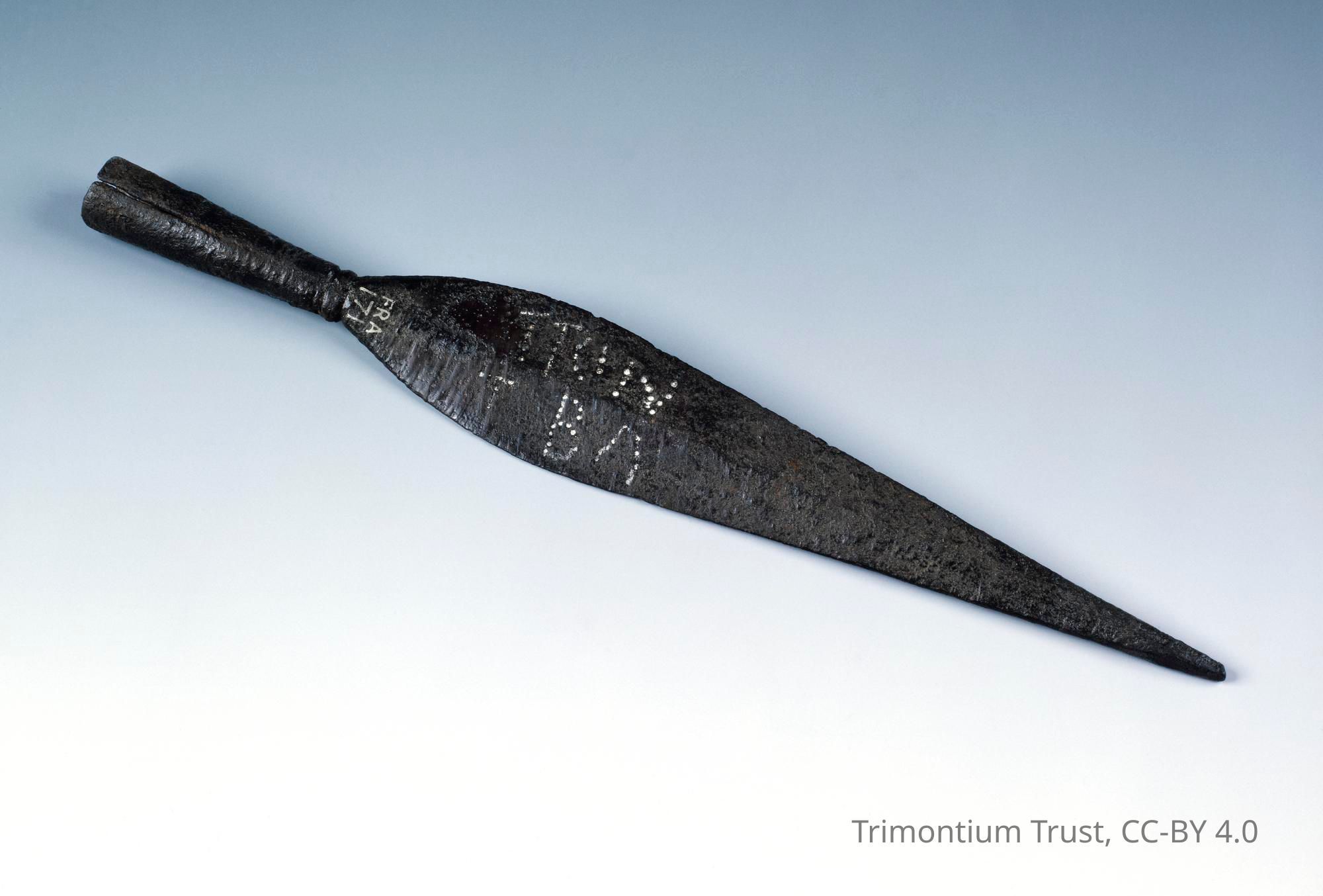 Iron spearhead with punctured inscription indicating ownership, from the Roman site at Newstead (Trimontium). 80-100 AD